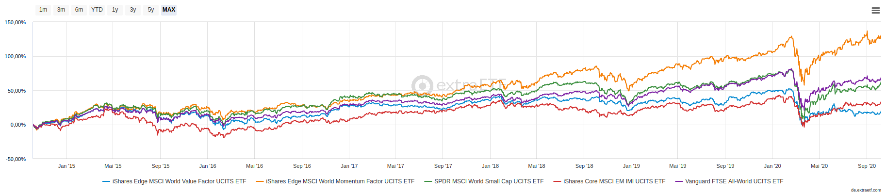 Barqu Oktober 11, 2020 · bearbeitet Oktober 11, 2020 von Barqu 49 minutes ago, Sestertius said: Die konkrete Frage kann ich zwar leider nicht beantworten, aber (wenn man MSCI glaubt) hätte ich als Näherung einen Vergleich MSCI World/MSCI Faktorportfolios anzubieten. Erklärung: DMF= Diversified Multiple Factor Index Factor Mix= Momentum/Enhanced Value/Equal Weighted (=Size)/Quality Einzelindizes (gleichgewichtet) Zeitraum= Vmtl. so gewählt, dass World Standard dumm aussieht Die Frage ist halt wie viel Marketing in den Daten steckt, aber wer Backtestdaten zu MSCI Produkten sucht, wird wohl auch nur bei MSCI fündig werden :^) PS: Das letzte kleine (=schlampige) Rebalancing habe ich Mitte Mai gemacht. Momentum knabbert aber inzwischen schon wieder an der Grenze Ich kenne leider keine gute Seite um einen Vergleich anzustellen und kann deinen Zahlen nicht ganz folgen, habe es nun aber spasseshalber mal bei extraetf eingetragen und bekomme dann nachfolgendes Bild: "20% Europa" fehlt aus C-Dogs Liste, aber man kann sich den EM IMI doppelt denken, denn die liegen sehr beieinander. Was ich - aber hier leider nur fuer 6 Jahre - sehe, bestaetigt meine Vermutung: Mit mehreren gegenlaeufigen Faktoren landet man gemittelt bei dem Index, der alle Faktoren enthaelt: einem stinknormalen All-World. Diesen Beitrag teilen Link zum Beitrag