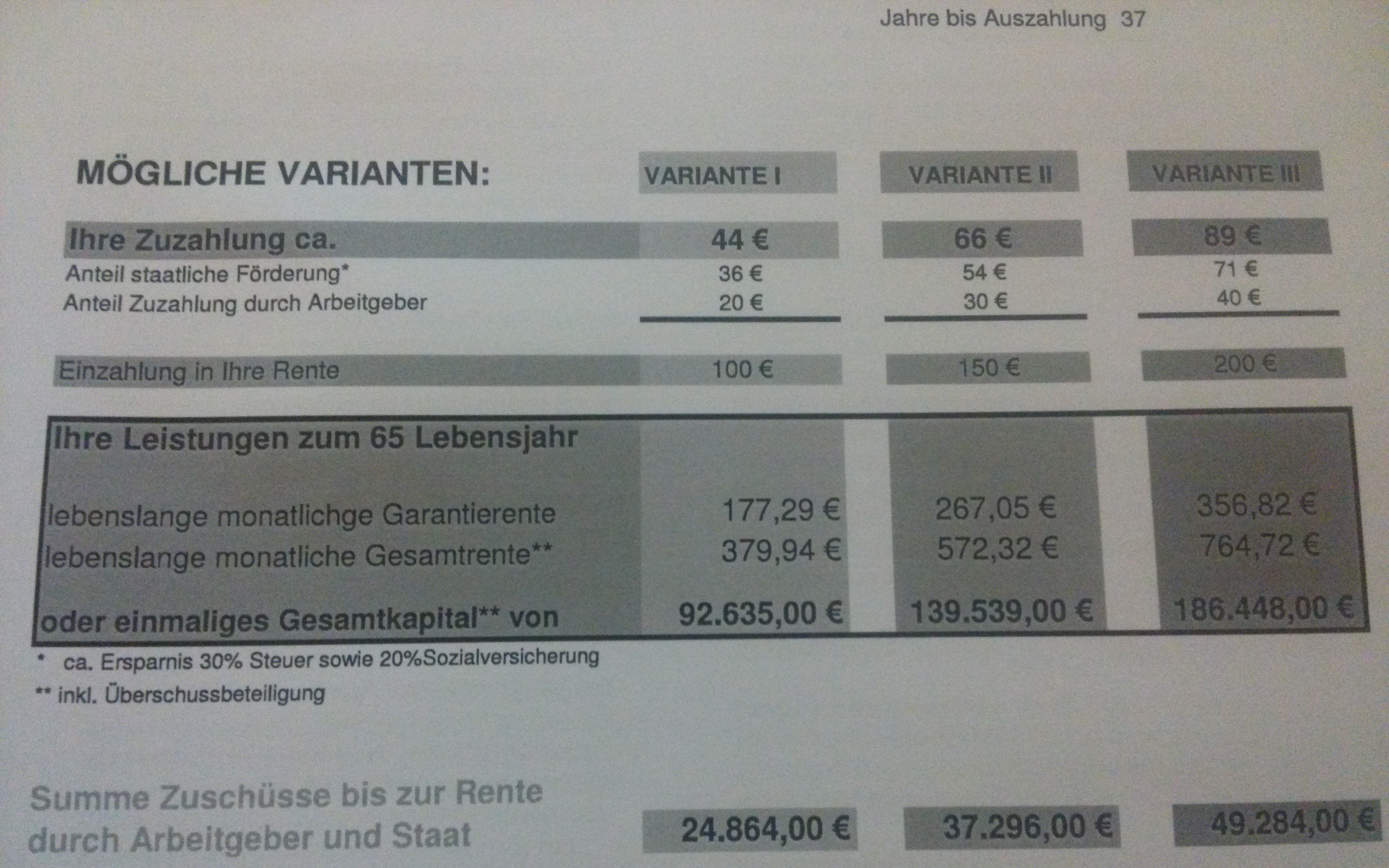 Thomas_384 Dezember 7, 2016 · bearbeitet Dezember 7, 2016 von Thomas_384 Mein Vorgehen bei sowas (muss für dich nicht passen): - Die Überschussbeteiligung würde ich erstmal gleich mental streichen - ist ja nicht garantiert und da kann sonstwas stehen. Bei meiner RV von 1999 werde auch absolute Phantasiezahlen hier aufgerufen. Fakt nach knapp 20 Jahren Einzahlung: 1,21 Euro circa Überschussbeteiligung (also im Endeffekt nix). - Warum steht da oben Jahre bis Auszahlung 37 aber gerechnet wird dann unten bis 65 (35 Jahre bis Auszahlung)? Bei deinem Brutto geht die Einzahlung in die BaV weg von deinen Einzahlungen in die gesetzliche Rente. Ausserdem musst du zu 100 Prozent versteuern. Wäre das mein Angebot würde ich bei Variante III mit netto 200,00 - 250 Euro Rente mit 65 rechnen. BaV geht vom Brutto weg. Riester vom Netto. Würde ich es abschließen: Nein Hast du dir Riester auch schon angeschaut (und die Unterschiede zur Bav verstanden)? Diesen Beitrag teilen Link zum Beitrag