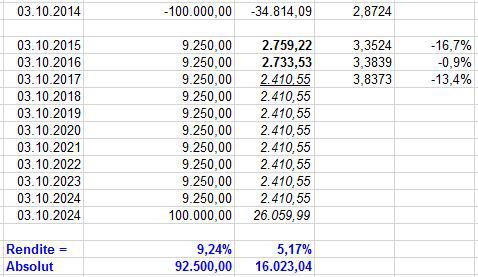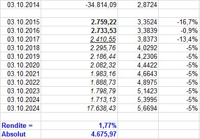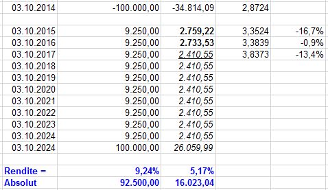 John Silver Januar 6, 2017 Hallo liebe Finanzgemeinde, gestern bin ich beim Zeitung lesen bei der Tabelle der internationalen Neuemissionen über eine Anleihe der Europäischen Investitionsbank (EIB) gestolpert (ISIN XS1115184753). Diese geht 10 Jahre (2 sind aber schon um), hat als Emissionwährung die türkische Lira und ein einen Kupon von 9,25 % pro Jahr. Aktuell ist die Rendite sogar über 10 % pro Jahr. Grob gesagt hat man also wenn man von Anfang an eingestiegen ist nach 10 Jahren den Einsatz wieder über die Zinsen raus, sprich Kapital verdoppelt. Die EIB hat ein AAA-Rating und die Rückzahlung sollte daher gesichert sein. Ich frage mich, wo ist denn da das Risiko? Der Währungskurs türkischen Lira wird doch nicht auf 0 fallen gegenüber dem Euro. Selbst wenn der Währungskurs sofort nach dem Kauf mit einem Schlag 50 % abwertet ist man doch immer noch + / - 0 am Ende. Heute stand in der Zeitung, die türkische Lira ist auf ein Allzeittief gefallen, 10 Jährige Staatsanleihen in Lira rentieren bei 11,02 % p.a. Außerdem wird doch immer gesagt ein niedrige Währung beflügelt den Export und die Wirtschaft (siehe Deutschland). Die Staatsverschuldung ist viel geringer als von vielen EURO-Staaten und die Bevölkerung ist auch jünger und schrumpft nicht. Das sind doch alles Gründe zu investieren. Wo ist der Haken? Das Risiko liegt in der Währung. Und das ist absolut nicht ohne. Wer am 03.10.2014 gekauft hat, hatte eine Rendite von 9,25%. Zu den heutigen(!) Wechselkursen ist seine Rendite auf 5,17% gesunken. In den letzten 2 1/2 Jahren hat die Lira um 33,6% abgewertet. Wenn das in dem gleichen Tempo weitergeht, kannst Du Dir ja ausrechnen, was am Ende in Euro von Deinem Investment übrig bleibt. Selbst bei einer Inflation von nur noch 5% pro Jahr, sinkt Deine Rendite auf 1,77%. Des Weiteren ist nicht die Höhe der Schulden oder deren prozentuales Verhältnis zu irgendeiner Messgröße relevant, sondern einzig und allein die Kreditwürdigkeit und die Kreditfähigkeit des Schuldners und der Glaube daran. Zumindest die Kreditwürdigkeit finde ich in letzter Zeit arg strapaziert. Muss natürlich aber gar nichts heißen. Bild 1 in Lira und Euro dargestellt. Bild 2 in Euro dargestellt. Der Kurs vom 03.10.2017 ist der Kurs von heute. 06.01.2017. Wenn die Lira dagegen aufwertet, bist Du natürlich auf der anderen Seite der King. Risiko ist natürlich oft auch irgendwo eine Chance. Diesen Beitrag teilen Link zum Beitrag