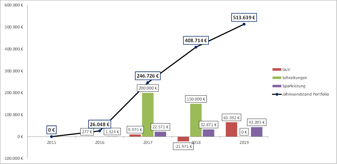 Die Sparleistung ist im Vergleich zum letzten Jahr nochmal deutlich gestiegen (u.a. aufgrund einer Gehaltserhöhung). In Summe habe ich in drei Jahren 100 TEUR gespart, darauf bin ich schon etwas stolz. Die hohen Kursgewinne in diesem Jahr wurden natürlich durch die Schenkungen erst ermöglicht, das ist klar.