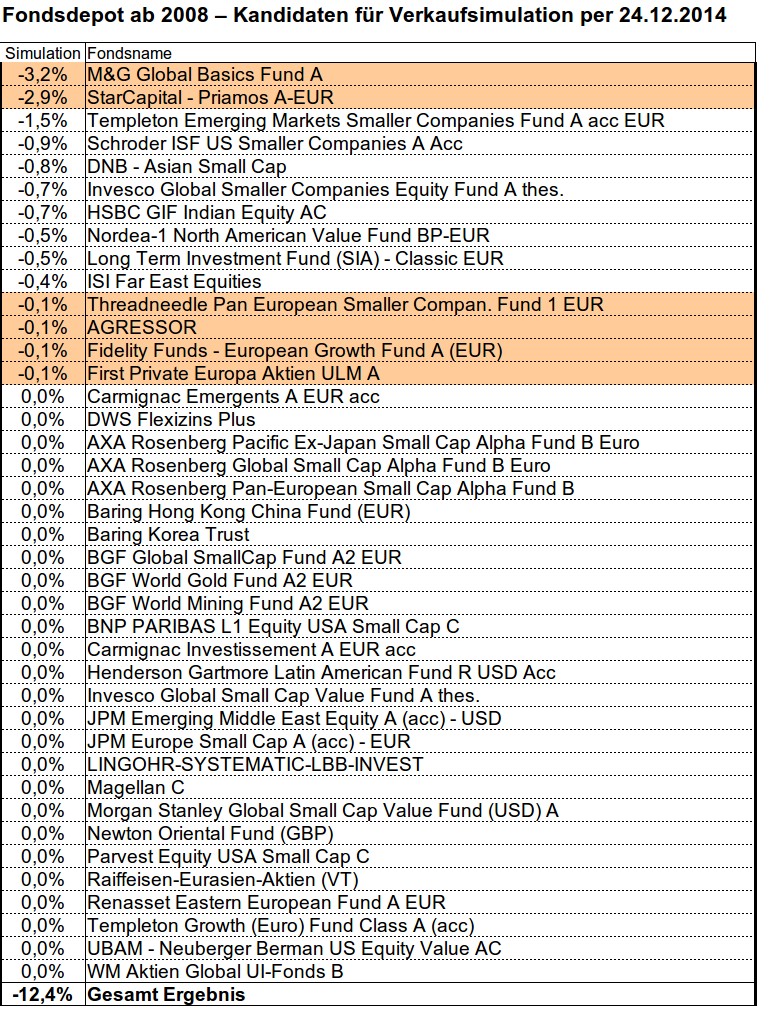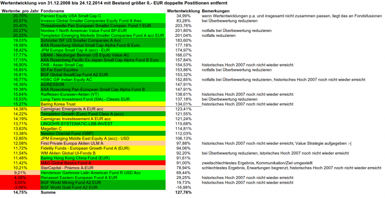 Laser12 Dezember 30, 2014 · bearbeitet Januar 18, 2015 von Laser12 Tun wir mal so als sei ich entsprechend meiner Finanzplanung für den (Un-)Ruhestand unterwegs und simulieren, was das im Moment für dieses Depot bedeuten würde. Das Depot hat mehr Erträge abgeworfen als eingeplant. Diese würden verwendet: - geplante Entnahme für den Lebensunterhalt - Inflationsausgleich - Verzicht auf Kapitalverzehr - zusätzliche Entnahme eines Puffers von ca. 5 Monaten mit Ausgabenniveau 125% (z.B. zum Aktienkauf in der nächsten Flaute, größere Anschaffungen, zusätzliche Sicherheit, das kann später bei Bedarf entschieden werden) In so einem Fall wäre ein steuerfreier Altbestand abzugeben. An Einzelfonds stehen 36 zur Auswahl. Entweder gehen die Nieten raus, von jedem wird ein bisschen verkauft, es wird diese Gelegenheit für ein Rebalancing genutzt oder ein bisschen von allem. Schauen wir uns zunächst die Wertentwicklung der einzelnen Fonds an: Die Fondsnamen habe ich markiert, ob sie aus meiner heutigen Sicht grundsätzlich kaufbar (= grün) sind - unabhängig vom Bewertungsniveau. Es lassen sich 2 Fonds entfernen, ohne dass es eine wesentliche Veränderung auf die regionale Struktur: StarCap Priamos: Dieser Fonds hat es 2008 nur mit Ach und Krach überhaupt in das Depot geschafft. Die Performance ist stark unterdurchschnittlich. Er hat mittlerweile einen EM-Anteil von 38% nach nahezu 0% bei Kauf. Damit verschlechtert sich das Chance-Risiko-Verhältnis. Sein historisches Hoch hat er immer noch nicht wieder erreicht. Man kann auch nicht sagen, das Value-Fonds insgesamt schlecht gelaufen sind. Jedenfalls sehe ich keinen Grund, warum der Fonds zukünftig ein Überflieger werden sollte. M&G Global Basics: Bei diesem Fonds wurde eine Todsünde begangen. Man hatte eine klare Strategie und hat diese über Bord geworfen, als der Wind etwas rauher wurde. Zudem ist man kommunikativ seit längerer Zeit nur noch am Rumeiern. Wenn man nicht weiß, was man will, ist ein gutes Ergebnis eher zufällig. Jetzt wo die Rohstoffwerte schlecht laufen, ist der Fonds nicht damit voll gesogen, um den Rückstand aufzuholen. Der Fonds hat jetzt nicht die völlig andere Struktur als die Wettbewerber, die mich eine zukünftig überdurchschnittliche Entwicklung erwarten lässt. Den Frist Private Europa Aktien Ulm lasse ich erst einmal vom Haken, da Europa seit längerer Zeit schwächelt und die Unternehmen sich vielleicht mal am Riemen reißen, wenn die Politik schon nicht dazu bereit ist. Der Carmignac Emergents bringt trotz höheren Risikos nur 0,2% p.a. mehr Rendite als der Investissement. Das ist unangemessen. Wenn ein höherer Betrag durch Verkäufe realisiert werden sollte, wäre der Emergents wahrscheinlich mit dabei. Diesen Beitrag teilen Link zum Beitrag