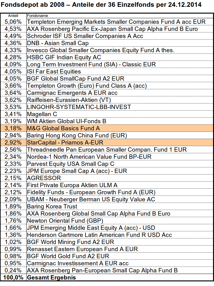 Laser12 Dezember 24, 2014 Moin, nach den Rückschlägen im Dezember steht das Depot derzeit bei ca. +13,3% YTD. 2008 hatten die meisten Fonds eine Positionsgröße von 1,8% oder 3,6%. Die letzten 6 Jahre hat sich ohne Käufe oder Verkäufe diese Verschiebung der Anteile ergeben: Markiert sind 2 Fonds, die ich aus heutiger Sicht nicht mehr kaufen würde. Später werde ich noch eine Simulation einstellen, wie ich das Depot verändern würde, wenn ich heute schon im (Un-)Ruhestand wäre. Diesen Beitrag teilen Link zum Beitrag
