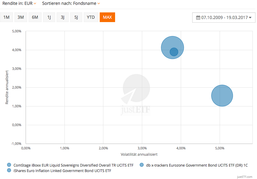 Horax März 20, 2017 · bearbeitet März 20, 2017 von Horax Anleihen hinzugefügt vor 37 Minuten schrieb west263: eigentlich sogar eine gute Entscheidung, so an die Sache heran zu gehen. Ich glaube, das viele ihre Risikotoleranz viel zu hoch einschätzen. Wenn Du merkst, es könnte etwas mehr Risiko sein, kannst Du das jederzeit ändern. Danke. vor 30 Minuten schrieb Joseph Conrad: Die Risikotoleranz steigt gewöhnlich mit dem Alter, dem Depotvolumen und der Anlagedauer. Irgendwann kommt ein Crash in jedem Anlegerleben. Wenn dann der Buchverlust derart groß ist, werden ihn die meisten von uns aussitzen wollen bzw. müssen. Ich habe schon 2 richtige Börsencrashs mitgemacht und bin jedes Mal schußhärter geworden. Weil es stets wieder nach Oben und zu neuen Höhen ging. Ich hoffe , das dies auch in Zukunft so sein wird. Das denke ich auch, dass einige Neuen sich hier etwas überschätzen. Aber wie bereits hier erläutert wurde ist es auch relevant wie ich mein Vorsorgeplan anlege, als Einmalanlage oder als Sparanlage. Wie bereits @Mvp dies kurz näher erläutert hat. vor 30 Minuten schrieb Joseph Conrad: Deine Portfolio Variante 2 finde ich gut. Ich habe allerdings noch europäische und amerikanische Nebenwerte beigefügt. Anleihen würde ich zur Zeit noch über Festgeld ersetzen. Danke, aber mit 500€ als Sparanlage würden es zu viele ETF´s sein die bespart werden müssen und mit der Aufteilung bin ich doch gut diversifiziert, oder? vor 30 Minuten schrieb Joseph Conrad: 10g Gold zu kaufen halte ich für weniger günstig. Das Geld würde ich in Aktien fließen lassen. Wenn überhaupt Gold dann größere Barren ab 100g Ich denke 100g sind zu teuer. Bei den 10 Gramm wollte ich auch den Durchschnittspreiseffekt ausnutzen, wie bei meinem Sparplan. Aber prinzipiell würdest du, wenn du in Gold investierst, einmalig eine große Menge kaufen? Ich habe eine Inflationsgeschütze Anleihe (ISIN IE00B0M62X26, WKN A0HGV1) gefunden, die in Euro gehandelt wird. Jedoch nur in Frankreich (45%), Italien (30%), Deutschland (17%) und Spanien (7%) beinhaltet. Mal sehen was sich noch so findet. In Anleihen würde ich schon gerne anlegen, damit im Falle eines starken Kursrückganges von Aktien das Depot gesichert ist. edit 1: - ISIN FR0010737544, WKN LYX0EE - ISIN LU0444605645, WKN ETF500 - ISIN IE00B0M62X26, WKN A0HGV1(zusätzlich Inflationsgeschützt) Das Risiko/Rendite-Verhältnis von den Drei würde wie folgt aussehen: Die Rendite von den Drei würde wie folgt aussehen: Diesen Beitrag teilen Link zum Beitrag