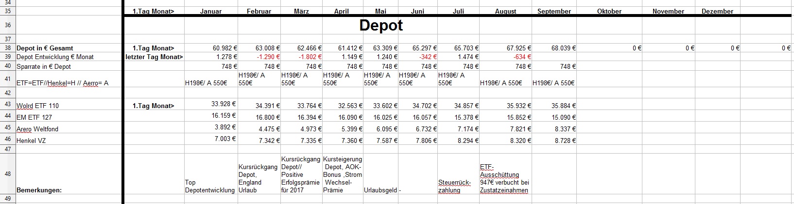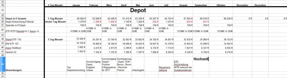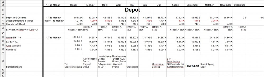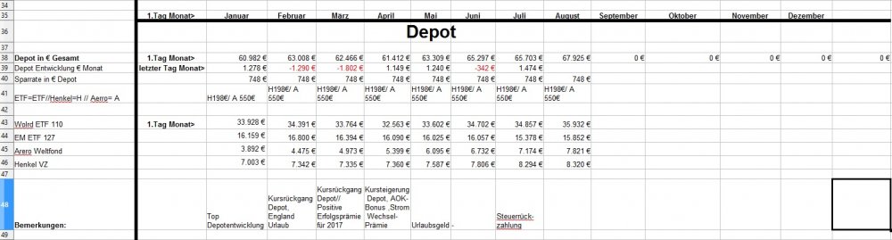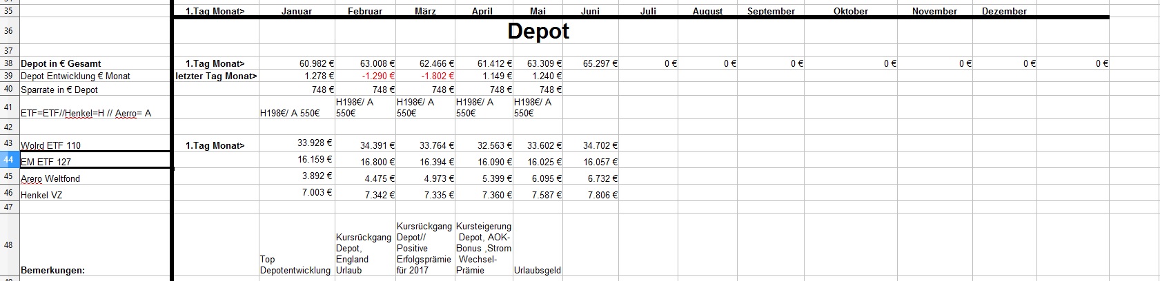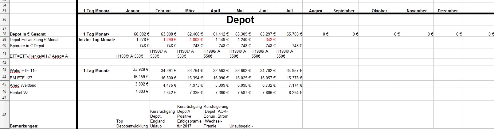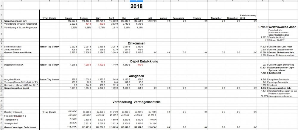 *Teufel* Juli 4, 2018 · bearbeitet Juli 4, 2018 von *Teufel* am 01.07.2018 +1518€ ist das "Vermögen" gewachsen auf nun 121079€ für Juni: Positiv: nicht viel ....evt guter Lohn für zuviel Arbeit^^ Negative: EM ist weiter am sinken ,Henkel etwas gestiegen zum Schluss ging es insgesamt um nur 342€ Abwärts Sonstiges: Ich war den Monat recht sparsam so hab ich zum Leben nur 951€ mit Vorsorge gebraucht. Welche Gedanken mache ich mir zurzeit?: *wenn es noch etwas mehr abwärts geht wäre evt etwas später ein neuer EM-ETF Sparplan interresant? Aber zurzeit hab ich eh nicht viel Geld über zum Anlegen.... Tagesgeld hab ich den Monat um 1005€ erhöht pkus Sparplänen (748€) also grob 1,75k beiseite gelegt *da ich denke für 2019 weder Kind noch Umzug oder ein Neues Auto anzuschaffen , planen wir für 2019 nun eine Fernreise 3Wochen mit Tauchen etc (die Zeit soll genutzt werden bevor es mit Kind nicht mehr so möglich ist) *Meine Frau plant nun einen Doktortitel in 2019 zu machen und deshalb ein 1Jahr auszusetzen.... (ob sie jemals Geld verdient?^^)(aber so ist es halt wenn die Frau 5 Jahre plus Jünger ist) das steht im Raum: (SK Stelle 19 Stunden zu 750€ Brutto )(bezahlte Doktorarbeit) Entscheidung wird wohl im Juli fallen. am sonsten war ich doch postive überrascht das sie schon 2,3 Rentenpunkte hat und eine Betriebsrente die 23€ Wert ist... >>> zurzeit geht von ihren Nebenjob nur was für die gesetzliche Rente weg achja Privat hab ich meine Ziel dank memory effekt erreicht 3 Monate durch die Hölle und nun fertig Top hätte nicht gedacht das mein Rücken so hoch wieder belastbar ist Diesen Beitrag teilen Link zum Beitrag