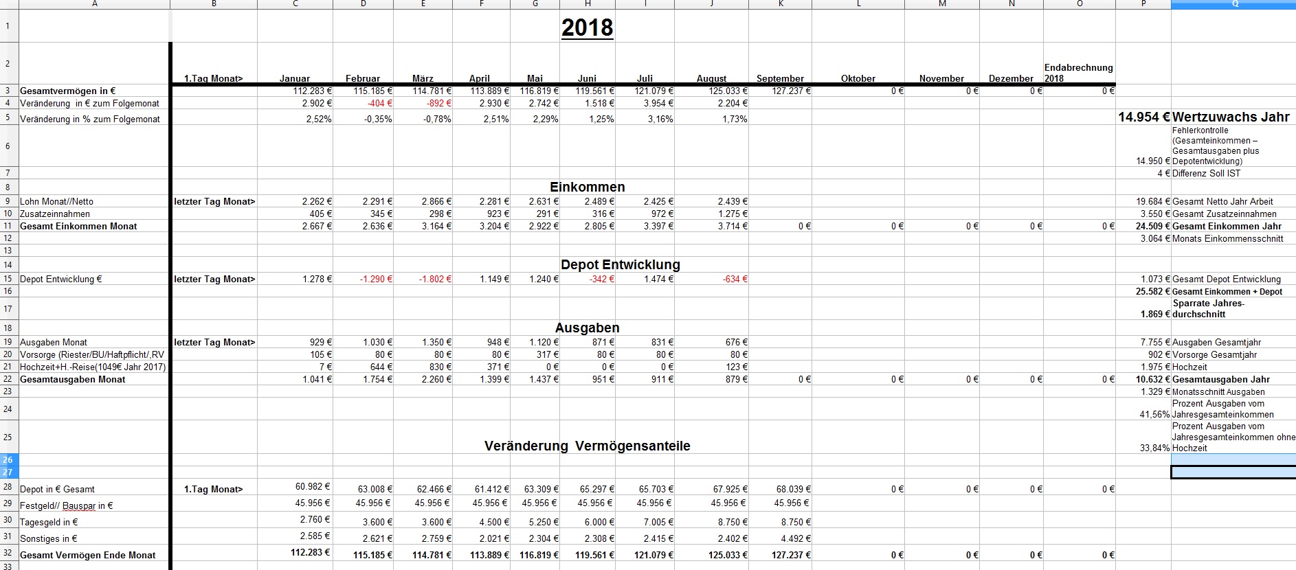 *Teufel* September 2, 2018 · bearbeitet September 2, 2018 von *Teufel* am 01.09.2018 +2204€ ist das "Vermögen" gewachsen auf nun 127237€ für August: Positiv: der Monat war ok, ich war wieder viel zu viel Arbeiten....dadurch recht guter Lohn und wenig Ausgaben , folge war ein gutes Plus für August. Negative: - Sonstiges: ETF Ausschüttung 947€ diese sind nun aus dem Depot draußen....ich musste sie ja iregendwo verbuchen (unter Zusatzeinnahmen) , ich weis das ist so nicht Richtig...aber sonst bekomme ich für diese Summe ein Fehlbetrag:/ . (also Rechte Tasche linke Tasche.) Vergleich 01-08 2017 zu 01-08 2018 2017 Einkommen Arbeit bis August 19492€ 2018 Einkommen Arbeit bis August 19684€ (192€ ca 1% mehr Netto.....) 2017 Ausgaben Leben bis August 7387€ 2018 Ausgaben Leben bis August 7755€ (368€ mehr Ausgaben 5% Steigerung) Einschätzung: Eikommen: hat sich mehr gesteigert , da eine Extra Prämie ,durch Betriebsvereinbarung (gekündigt) gestriechen wurde , auch hab ich diese Jahr keine Verbesserungsvorschläge eingereicht . (Bruttoverlust Gesamt 600€) Ausgaben : mehr Reisen macht das Leben etwas teuerer. für den Rest des Jahres erwarte ich noch einige extra Ausgaben da ich nun wieder jeden Monat irgendwo einen Kurztrip machen werde. Insgesamt hab ich zurzeit nicht das Gefühl das mir zurzeit etwas fehlt! aber mehr Reisen das würde ich gern. Träume für 2019 Amsterdam oder Kopenhagen 4-5Tage Weimar ein Wochende 3 Wochen Fernreise (Malaysia?) Rucksack tour Wien + Vendieg evt noch 1-2 Städereisen mehr. ich nutze diese Gutscheine https://travel-dealz.de/blog/a-und-o-hotel-gutschein/ für meine Städereisen und mit Flixbus hin. kostet also sehr wenig. Welche Gedanken mache ich mir zurzeit?: September überleben Diesen Beitrag teilen Link zum Beitrag