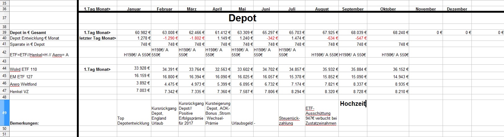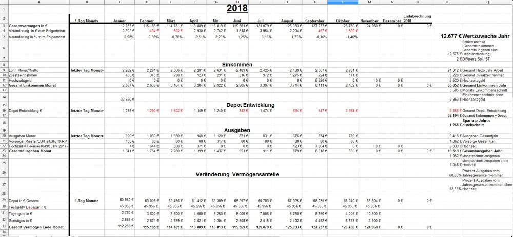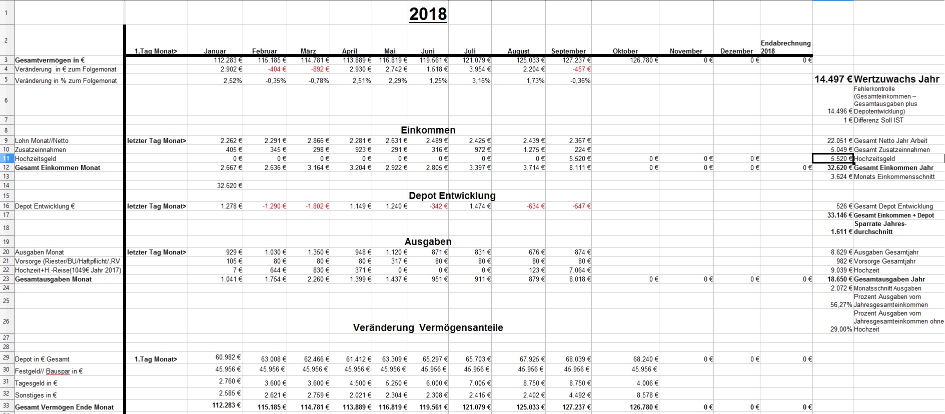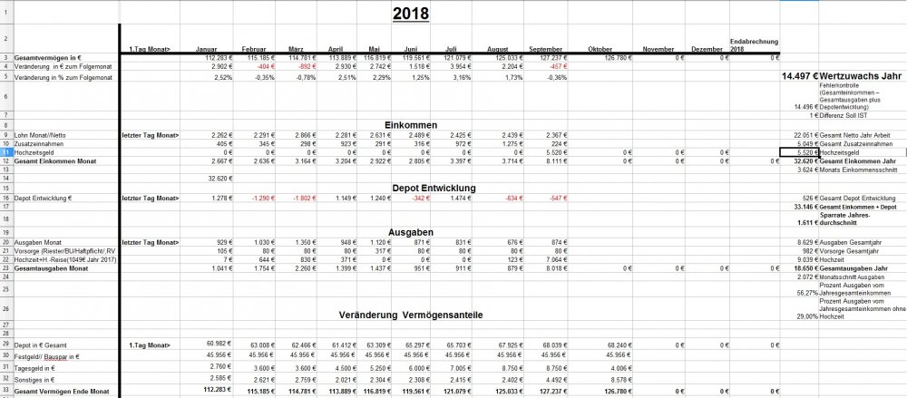*Teufel* Oktober 14, 2018 · bearbeitet Oktober 14, 2018 von *Teufel* ok am 01.010.2018 -457€ ist das "Vermögen" geschrumpft auf nun 126780€ Hochzeit: So nun bin ich unter der Haube und zurück von der Hochzeitsreise. es war eine wundervoll schöne Hochzeit ,die lieder viel zu schnell vorbei ging. So war unsere Hochzeit: * standesamtliche Trauung im Barockgarten * Limousinenfahrt zu unserm Schloss(cafe) * Sektempfang * Taubenflug * Kaffee trinken * Schlossführung für Gäste (Fotoshooting Zeit) * DJ ab 18 Uhr zum Abendbuffet * Spiele und Reden * Feuershow * Hochzeitstanz * Ende war gegen 3Uhr > am nächsten Tag ging es auf die Hochzeitsreise nach Malta (8Tage) wir waren 53 Leute plus 2 Kinder und 2 Dienstleister Die Hochzeit + Reise hat 12500€ gekostet (2400€ Frau , 10100€ Man) und es gab zur Hochzeit von den Gästen 6520€ (wovon Eltern + Schwiegereltern 4000€ stammen ) (falls es jemanden interressiert kann ich auch eine Kostenaufstellung liefern?) für September: Positiv: - Negative: na an den Börsen wird die Luft etwas rauer... , bin ganz schön froh das ich die Henkel Aktien mit 33,33% Rabatt bekomme Sonstiges: da ich nun unter der Haube bin.... komme wieder mehr Gedanken wie es weiter geht: * es steht nun doch schon Famielenplanung an (nächstes Jahr) >>> dadurch haben wiir die Steuerklasse 3/5 gewählt. * eine Rucksacktour fällt bei so ein Zustand aus >>> es wird zurzeit darüber Nachgedacht 14Tage nach Afrika zureisen. aber im großen und ganzen Läuft alles zu Porttrader das ist so mit meiner Frau abgesprochen , es gibt da kein bereichern , es bleibt auch weiterhin bei getrennten Kassen und später eine Haushaltskasse. Meine Schwiegereltern sind auch da weiterhin sehr großzüig statt ab jetzt 100€/Monat läuft es erst langsam aus Okt 400€> Nov 300€ Dez 200€ und ab Jan 100€ plus alle Studiengebühren. dazu hat sie ja noch ihren Nebenjob der 550€ bringt bzw 500€ in Steuerklasse 5. Miete oder nennen wirs Wohnungsbeteilung meiner Frau 50€ ab Okt. Diesen Beitrag teilen Link zum Beitrag