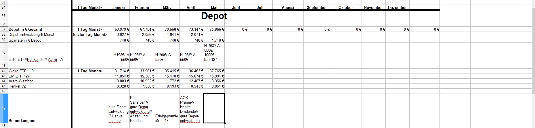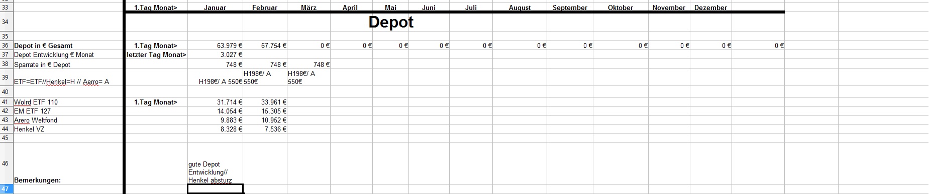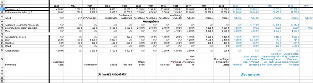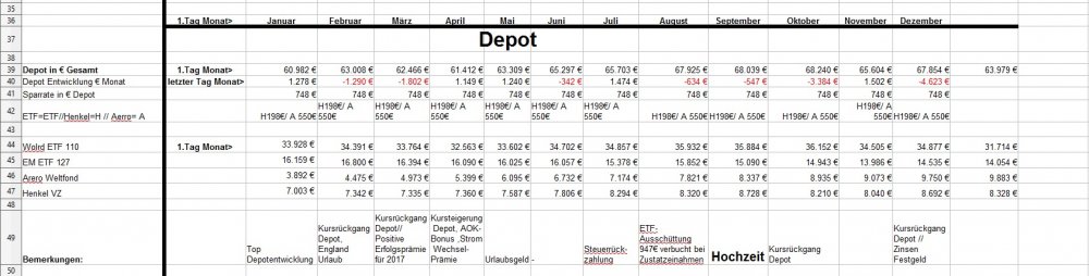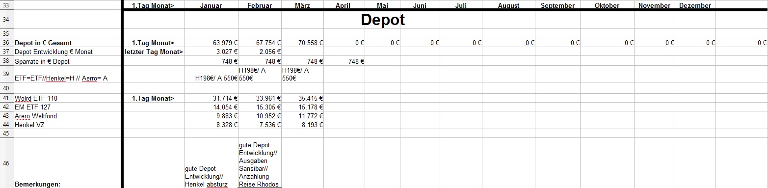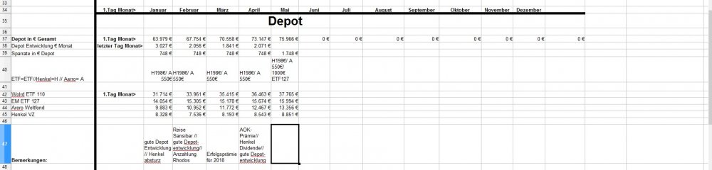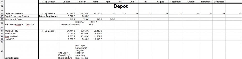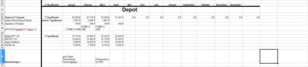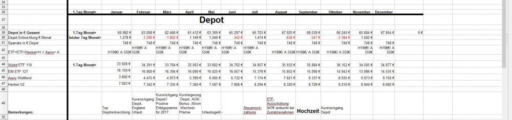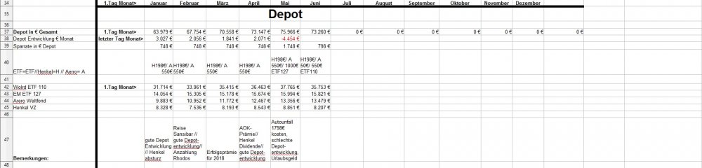 *Teufel* Januar 31, 2019 · bearbeitet Januar 31, 2019 von *Teufel* am 01.02.2019 +4926€ ist das "Vermögen" gewachsen auf nun 131718€ das höchste Plus in meinen Leben für Januar: Positiv: Depotentwicklung + 3027€ , Nachzahlung Lohn und geringe Ausgaben für Januar. Negative: Henkelaktien sind ganz schön abgestürzt -13% für Januar /(Wert 7536€ Eingezahlt seid 01.01.15 9607€ mit 33,33% Bonus AG) Welche Gedanken mache ich mir zurzeit?: 1.CareFlex – die Pflegezusatzversicherung von Henkel https://webcache.googleusercontent.com/search?q=cache:G_zzft0tR7IJ:https://www.henkel.de/blob/890982/fc375383747c6dc1f141b68814441c3f/data/2018-11-12-careflex-hintergrund-zahlen-und-fakten-zur-pflege.pdf+&cd=1&hl=de&ct=clnk&gl=de&client=opera >>> kostet 29€ im Monat und wird aus dem Demografiebetrag finanziert (AG Beitrag) " Die Pflegezusatzversicherung CareFlex besteht aus drei Bausteinen: 1. Basisabsicherung für alle Mitarbeiter in Deutschland: Mit 29 Euro/Monat sind monatlich 1.000 Euro (Pflegegrad 2-5 für die stationäre oder teilstationäre Pflege) bzw. 300 Euro (Pflegegrad 2-4 bei häuslicher Pflege) abgedeckt." >>>>>>> dafür sinkt die Einzahlung in die Altersvorsorge :/ und diesen Vertrag kann man nicht kündigen! (bzw bei Kündigung wird das Geld nicht wieder der AV zugeführt) 2. Bauspar Vertrag mein Vertrag läuft seid 2005 Bausparsumme 20k eingezahlt sind 18036,69€ (+ 1771€ im Treueguthaben ) >>>besparbar bis 18999€ um das Teureguthaben zuerhalten 3. Schufa Score beträgt nur 95,22 .... toll wenn die Mobilfunkanbieter Schufaeinträge machen >>> aber nicht bei Vertragsende löschen.... (dazu hab ich noch 3 Girokonten) wenn ich mal etwas lust hab räume ich da auf. 4. Sansibar Reiseplanung: Flüge 1206€, Unterkünfte 18Tage Airbnb 642€ , 2000€ // Dollar werden wir dort an Bargeld ca brauchen ,+ Plus Kleingramm für die Reise 700€ = 4500€ (ein großteil ist schon bezahlt in 2018) 5. Kommunikation Ich hab versucht mein Vertrag als Bestandskunde zuverbessern (2 Jahre rum) bzw etwas zu bekommmen bei Vodafone > 35min telefoniert.... Nix als Frust! man konnte mir nichts anbieten (Vertrag 10 Mbit für 19,90€) so hab ich aufgeben und so verlängert. >>> Aber die Wlan funktion hab ich gleich mal gekündigt (2€ Monat) und mir ein Router gekauft + ein Handyverträg gekündigt (1Gb Lte + 50min für 3€) und einen neuen 2Gb + 50min für 4,99€ abgeschlossen Diesen Beitrag teilen Link zum Beitrag