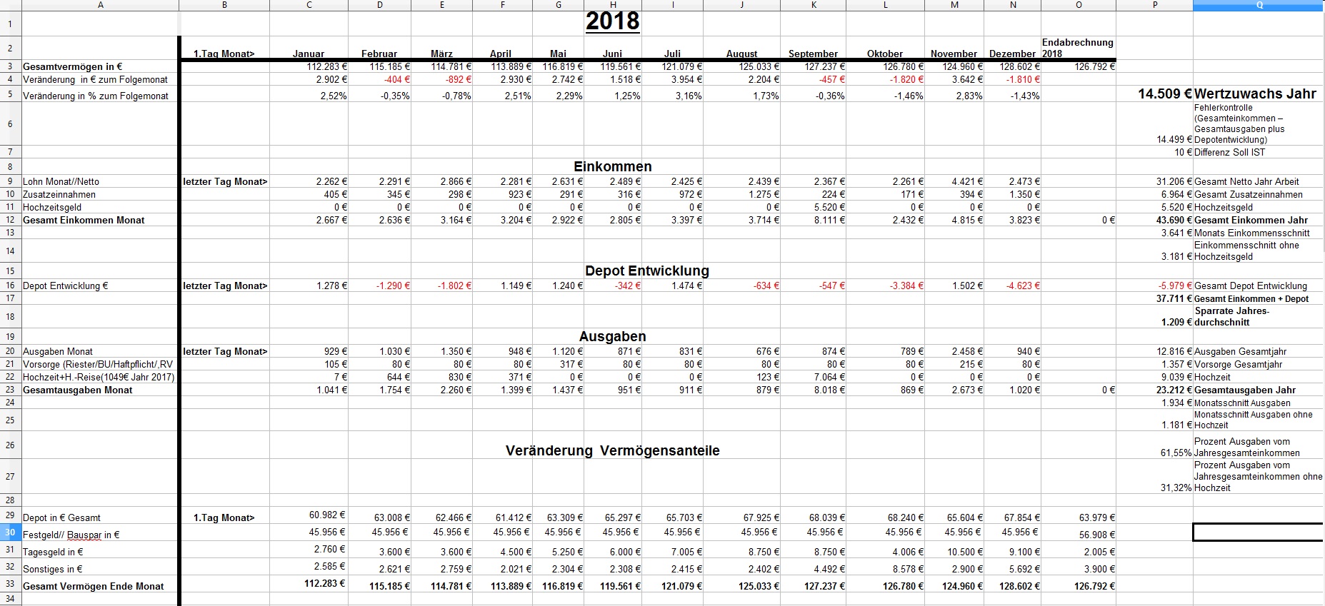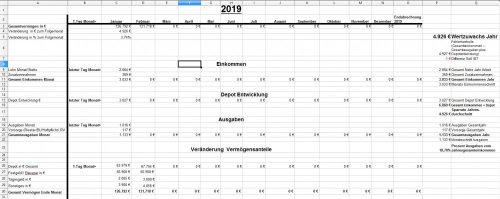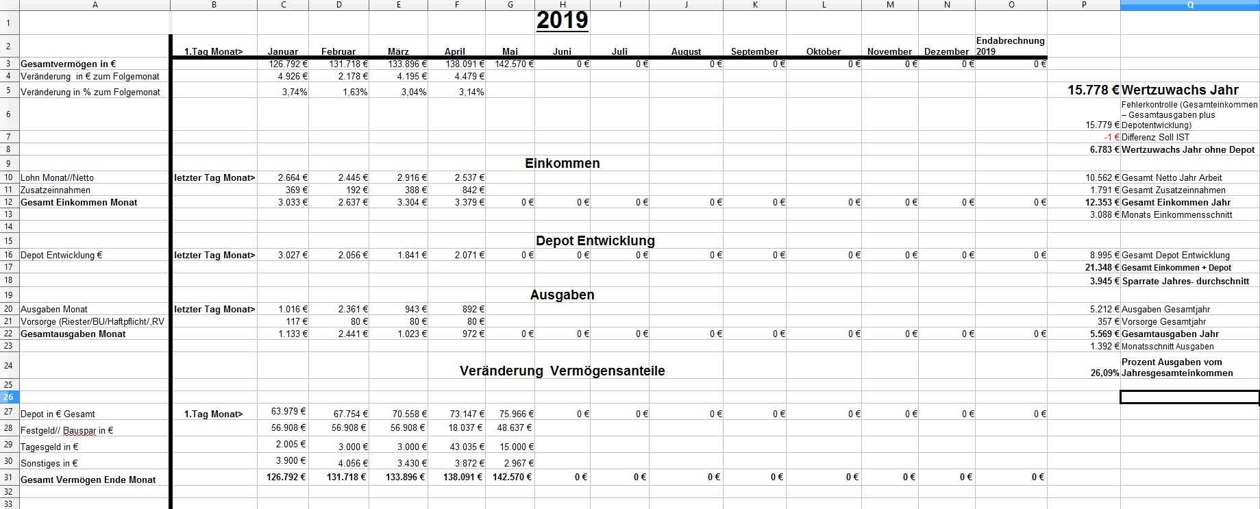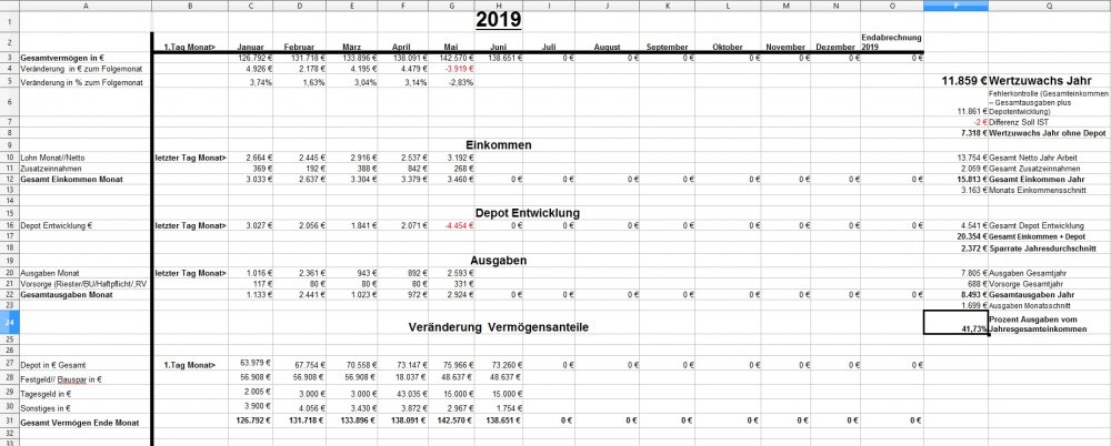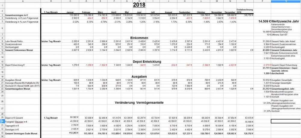 *Teufel* Dezember 31, 2018 · bearbeitet Dezember 31, 2018 von *Teufel* am 01.01.2019 -1810€ ist das "Vermögen" geschrumpft auf nun 126792€ >>> Jahresabschluss<<< von 112283€ auf 126792€ = + 14509€ Im ganzen war das Jahr 2018 ok. viel gereist und geheiratet ,dazu im Plus abgeschlossen ,nur die Börse hätte etwas netter sein können (-5979€ ) Für 2019: es wird wohl an der Börse so weiter gehen... Ich bleibe in Wartehaltung und entscheide im März Neu. (Neues Festgeld 10k für 3 Monate abgeschlossen) Ziel wäre 140k+ 2019 zuerreichen. was ändert sich 2019: *- 0,5h Arbeitszeit auf 39,5h/Woche * GKV Zusatzbeitrag geteilt (gespart 0,3%) , plus Grundfreibetrag hoch (168€) ,plus Einkommensgrenzen für alle Steuersätze werden 1,84 Prozent angehoben = ca 25€ Netto/Monat mehr * 3,6% Lohnerhöhung * Urlaubsgeld verdoppellt (600€ Brutto mehr) * Ich arbeite wieder VK ohne Sontag = 4% Lohnerhöhung Privat: *es steht ein langer Urlaub an (Sansibar) und ein paar kleine Reisen. *Familienplanung + Umzug? *ansonsten hoffe ich auf gute Gesundheit und ein schönes Jahr für Dezember: Positiv: Zinsen Festgelder (957€), Prämie Tarifabschluss 280€ Brutto Negative: Die Börse! 4623€ sind erstmal fort. Welche Gedanken mache ich mir zurzeit?: Ich hab mir über die Feiertage ein Jahresrückblick bis 2003 erstellt. Diesen Beitrag teilen Link zum Beitrag