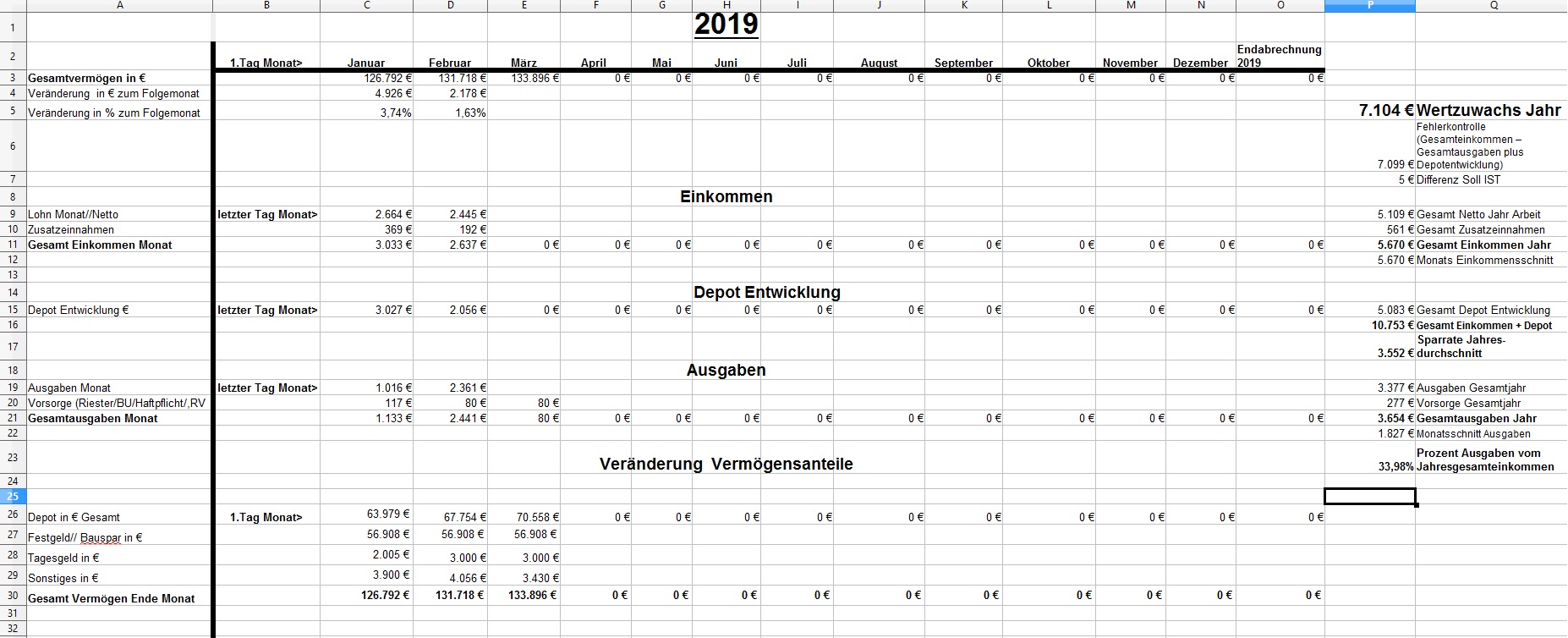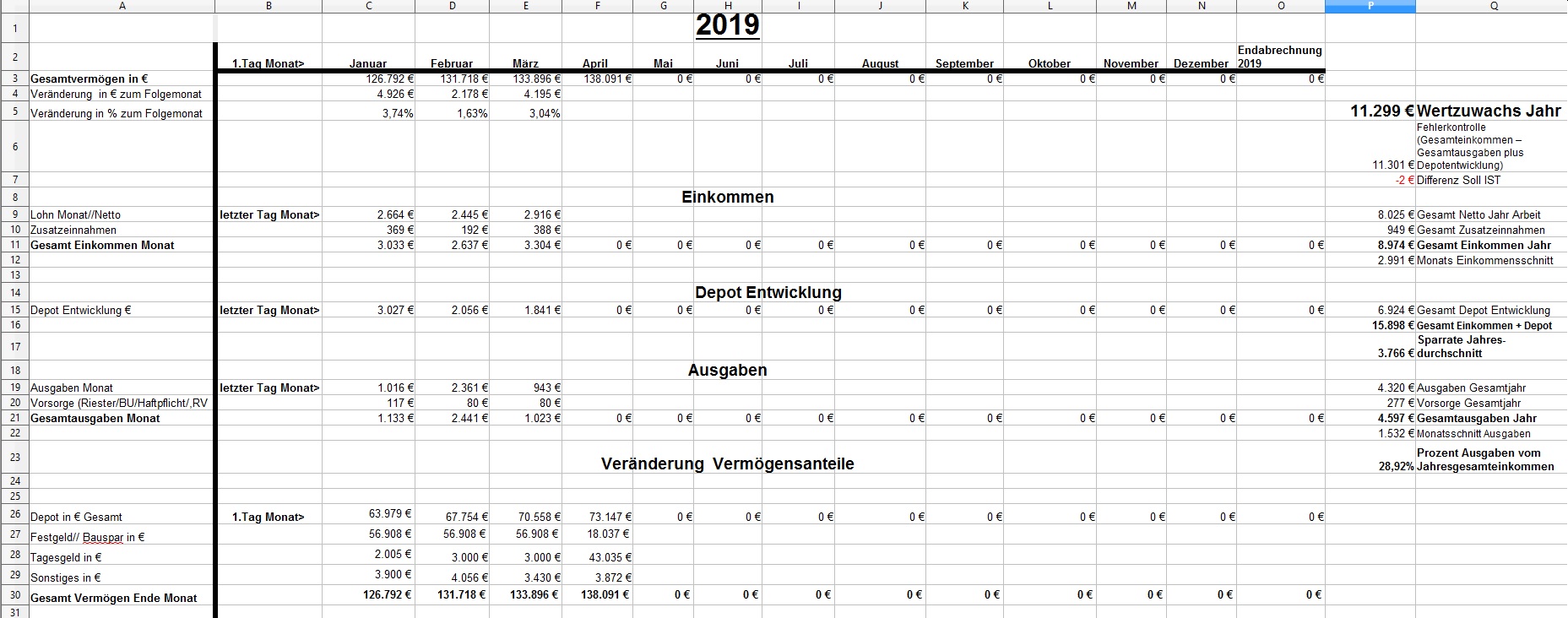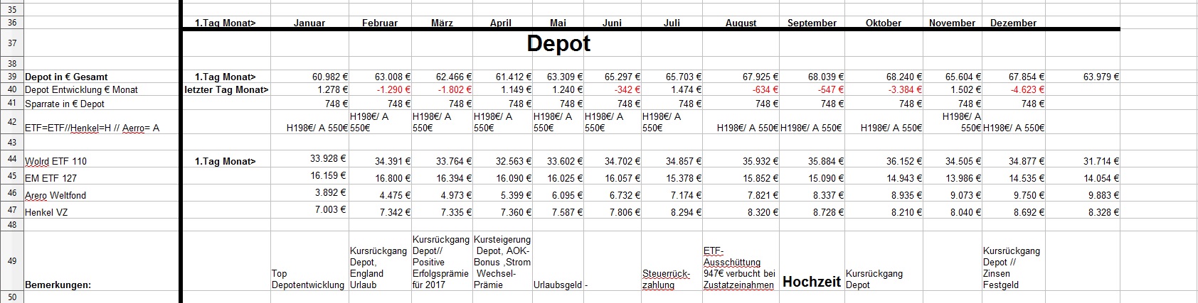 *Teufel* Dezember 31, 2018 · bearbeitet Dezember 31, 2018 von *Teufel* am 01.01.2019 -1810€ ist das "Vermögen" geschrumpft auf nun 126792€ >>> Jahresabschluss<<< von 112283€ auf 126792€ = + 14509€ Im ganzen war das Jahr 2018 ok. viel gereist und geheiratet ,dazu im Plus abgeschlossen ,nur die Börse hätte etwas netter sein können (-5979€ ) Für 2019: es wird wohl an der Börse so weiter gehen... Ich bleibe in Wartehaltung und entscheide im März Neu. (Neues Festgeld 10k für 3 Monate abgeschlossen) Ziel wäre 140k+ 2019 zuerreichen. was ändert sich 2019: *- 0,5h Arbeitszeit auf 39,5h/Woche * GKV Zusatzbeitrag geteilt (gespart 0,3%) , plus Grundfreibetrag hoch (168€) ,plus Einkommensgrenzen für alle Steuersätze werden 1,84 Prozent angehoben = ca 25€ Netto/Monat mehr * 3,6% Lohnerhöhung * Urlaubsgeld verdoppellt (600€ Brutto mehr) * Ich arbeite wieder VK ohne Sontag = 4% Lohnerhöhung Privat: *es steht ein langer Urlaub an (Sansibar) und ein paar kleine Reisen. *Familienplanung + Umzug? *ansonsten hoffe ich auf gute Gesundheit und ein schönes Jahr für Dezember: Positiv: Zinsen Festgelder (957€), Prämie Tarifabschluss 280€ Brutto Negative: Die Börse! 4623€ sind erstmal fort. Welche Gedanken mache ich mir zurzeit?: Ich hab mir über die Feiertage ein Jahresrückblick bis 2003 erstellt. Diesen Beitrag teilen Link zum Beitrag