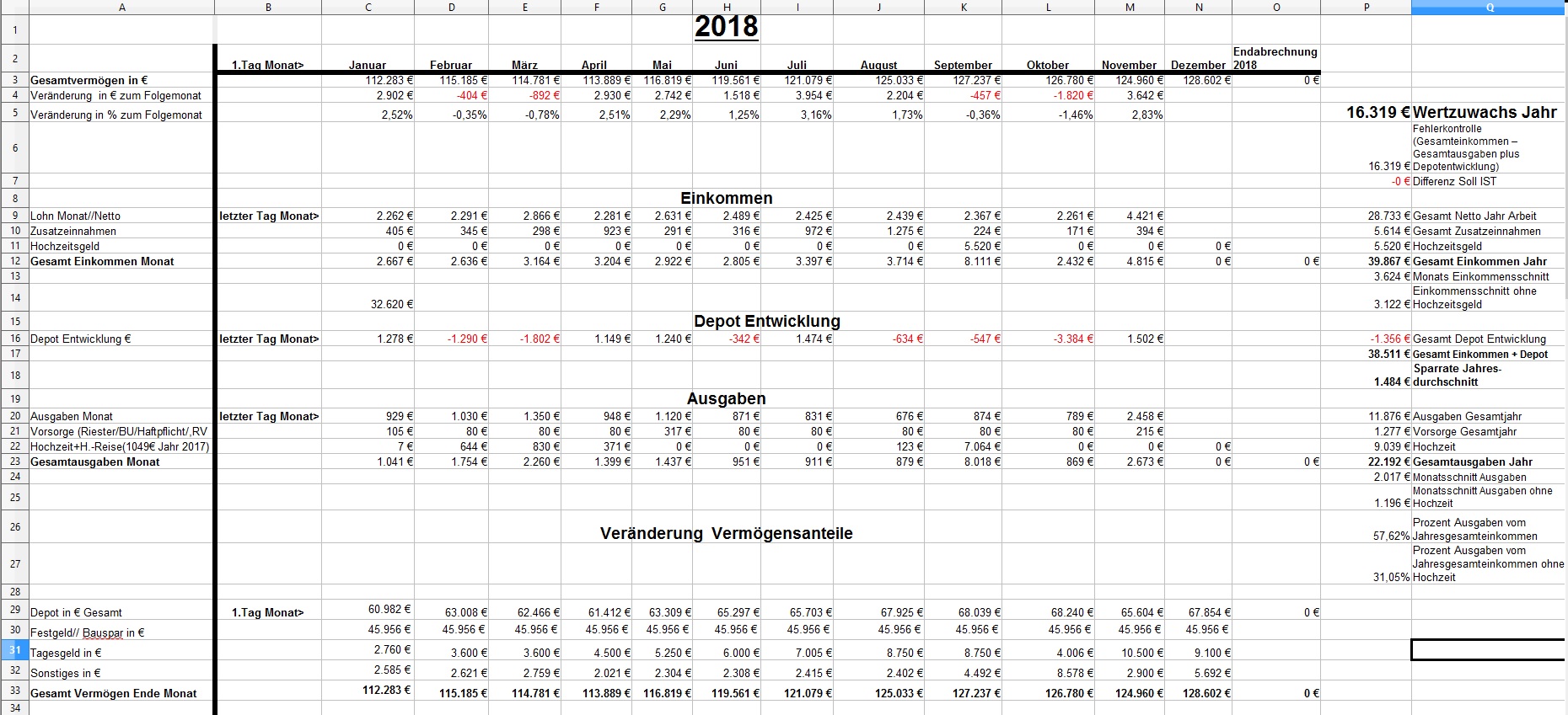 *Teufel* Dezember 9, 2018 · bearbeitet Dezember 9, 2018 von *Teufel* am 01.12.2018 +3642€ ist das "Vermögen" gewachsen auf nun 128602€ für November: Positiv: - Weihnachtsgeld (2730€ Brutto) , dazu gab es auch eine Steuerrückerstattung für Lohnsteuerklasse 3 (für Sep. und Okt.) und das Depot hat sich etwas erholt 1,5k Negative: hohe Monatsausgaben: von 2673€ (durch ein Spreewald We ca 350€) und für Sansibar: Flüge + Reisepass =1060€ ,dazu hab ich mehr Geld umgewandelt für die AV Welche Gedanken mache ich mir zurzeit?: Fragen: Diesen Beitrag teilen Link zum Beitrag
