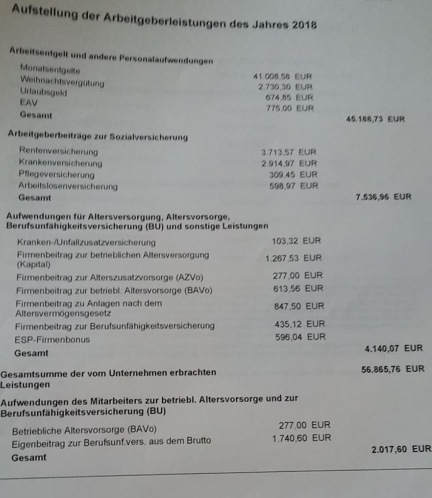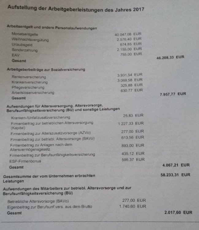 *Teufel* Juli 13, 2019 · bearbeitet Juli 13, 2019 von *Teufel* zum Steuerzahlergedenktage zwei Übersichten: in 2017 hat mein AG 58233€ und für 2018 56865€ für meine Arbeitskraft bezahlt. leider ist bei mir "nur" etwa 40k Steuerbrutto angekommen (die Sonderzahlung in 2017 ,waren Aktive Tage = Urlaub die mein AG für mich + Frau bezahlt hat) (anspruch alle 3 jahre) mit den Übersichten hab ich nun auch neue Zahlen zu meiner Altersvorsorge (Betrieb): Säule1: gesetzliche RV Anspruch ca 1600€ ( Daten aus 2018) Säule 2 Betrieb: *Pension:(Einzahlung Betrieb 3% vom Brutto ) garantiert 01.07.2053 50,8k ab 2017 >>>Betrieb Metzler Vorsorgefond (MI328) Kapitalerhalt Garantie Wert: 2,6k *Entgeltumwandlung: BAVo 13,6k *ChemiePensionsfonds 7,6k + *BU Schicht Entgeltumwandlung aus Überschüssen folgt eine Kapitalzahlung Alter 67 (fiktive 33k) Säule 3 Privat: *Riester DWS Top-Rente Dynamik Guthaben 13k *Rentenversicherung Allianz aus Dez 2003 Wert 2,8k = Gesamtbrutto ca 90,4k Diesen Beitrag teilen Link zum Beitrag