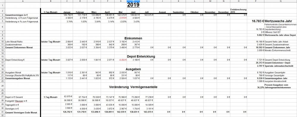 *Teufel* Juli 1, 2019 · bearbeitet Juli 1, 2019 von *Teufel* am 01.07.2019 +4924€ ist das "Vermögen" gewachsen auf nun 143575€ für Juni: Positiv: Depotentwicklung 3180€ Negative: - Sonstiges: * ab den 01.07. geht es für mich in die teilkontinuierliche Schichtarbeit ( -4% Bruttolohn) * Ich hab im Juni etwas mit EC-Karte und Pin bezahlt (25,10€ Restaurant) dieses Geld war auch vorgemerkt im Girokonto (gedeckt) wurde aber nie eingezogen???? (inzwischen ist es auch nicht mehr vorgemerkt?) * am 01.07. hab ich mein Sparplan nicht ausgeführt >>> konnte am Sa ncht mehr vom online Konto ins Verrechnungskonto überweisen (selbe Bank) werde also erst am 15.07. mein Sparplan für Juli ausführen. (vermutlich 1,8k in die ETFs) Privat: * läuft soweit bei mir:) ,bei meiner Frau ist es da schon etwas stressiger.... letzte Prüfungen fürs Semester, dazu die Doktorarbeit wo Sie in kurzer Zeit 7600 Studien sichten muss + Nebenjob. Bei meiner Weiterbildung bin ich kein Stück weitergekommen (Urlaubszeit//Krankenstand) auch stresst mich etwas die Familienplanung..... seid 4 Monate na ja nichts = abwarten. * ansonsten waren wir über meinen Geb. in Oberwiesenthal (Fichtelberg) zum Kurzurlaub. ( auch wird unsere Urlaubs//Kurzurlaubsliste für den Rest des Jahres immer länger )(Leipzig, Weimar , Spreewald , Vendig , Nünberg (Kurzurlaub) und Rhodos Urlaub) Welche Gedanken mache ich mir zurzeit: *Meine 3 Zeile für die nächsten 3 Jahre: 1. 200k Bruttovermögen 2. 125k + Depotwert 3. mit all meinen Altersvorsorgeverträgen 100k Brttovermögen erreichen. * auch würde ich gerne meine Ausgaben Monatsschnitt für 2019 unter 1400€ halten. (für die Ersten 6 Monate 1588€ / Monat) Diesen Beitrag teilen Link zum Beitrag