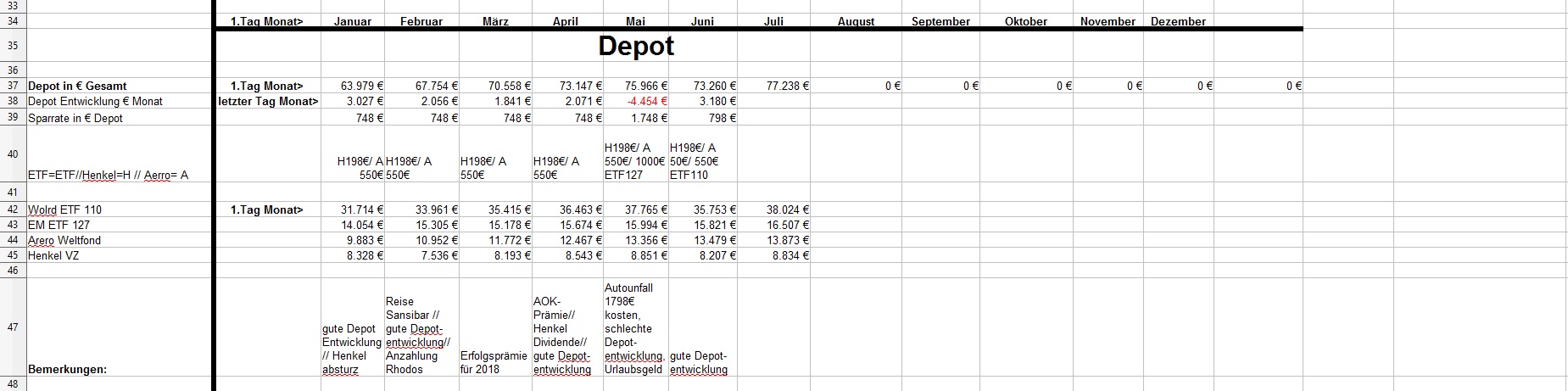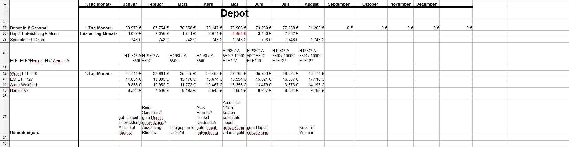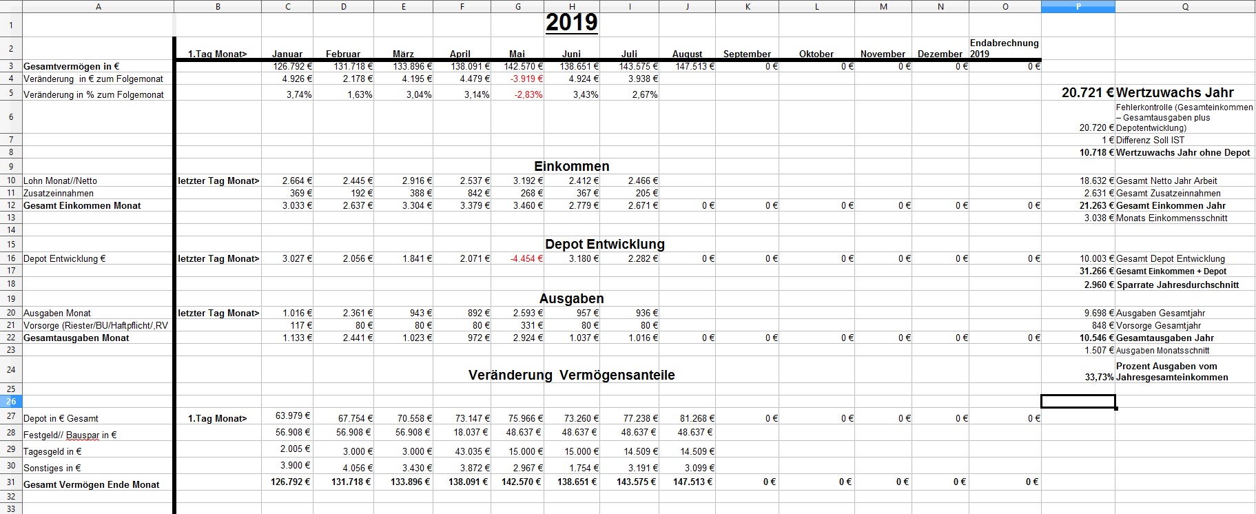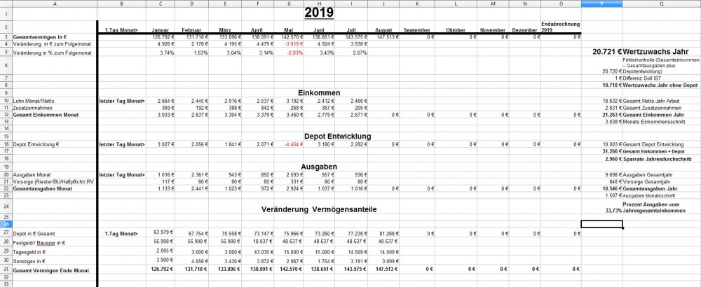 *Teufel* August 2, 2019 am 01.08.2019 +3.938€ ist das "Vermögen" gewachsen auf nun 147.513€ für Juli: Positiv: Depotentwicklung 2.282€ Negative: - Sonstiges: * Ich habe es doch noch geschafft meine Steuererklärung abzugeben..... nach 2 Versuchen... ob ich alles richtig angeben habe? (eine Frage ist geblieben:" meine Frau hatte in 2018 zwei Jobs gleichzeitig für 14Tage... und war in der Steuerklasse 1 jeweils. (was passiert da jetzt?) * Nachzahlung von Schichtzuschlägen im Juli * Ich hab im Juni etwas mit EC-Karte und Pin bezahlt (25,10€ Restaurant)>>>> hat sich geklärt, nach 5 Wochen abgebucht Privat: * So vergeht die Zeit, meine Frau hat wieder ein Semester erfolgreich geschafft und startet jetzt in ihre letzte Famulatur und bei mir war auch auch alles wie gehabt "arbeiten halt". * Wir waren auch mal zu einen Kurztrip in Weimar, echt eine schöne Stadt. Diesen Beitrag teilen Link zum Beitrag