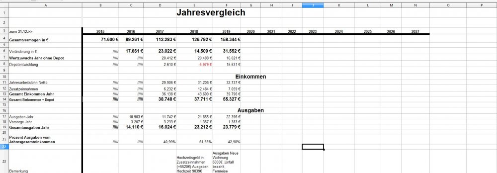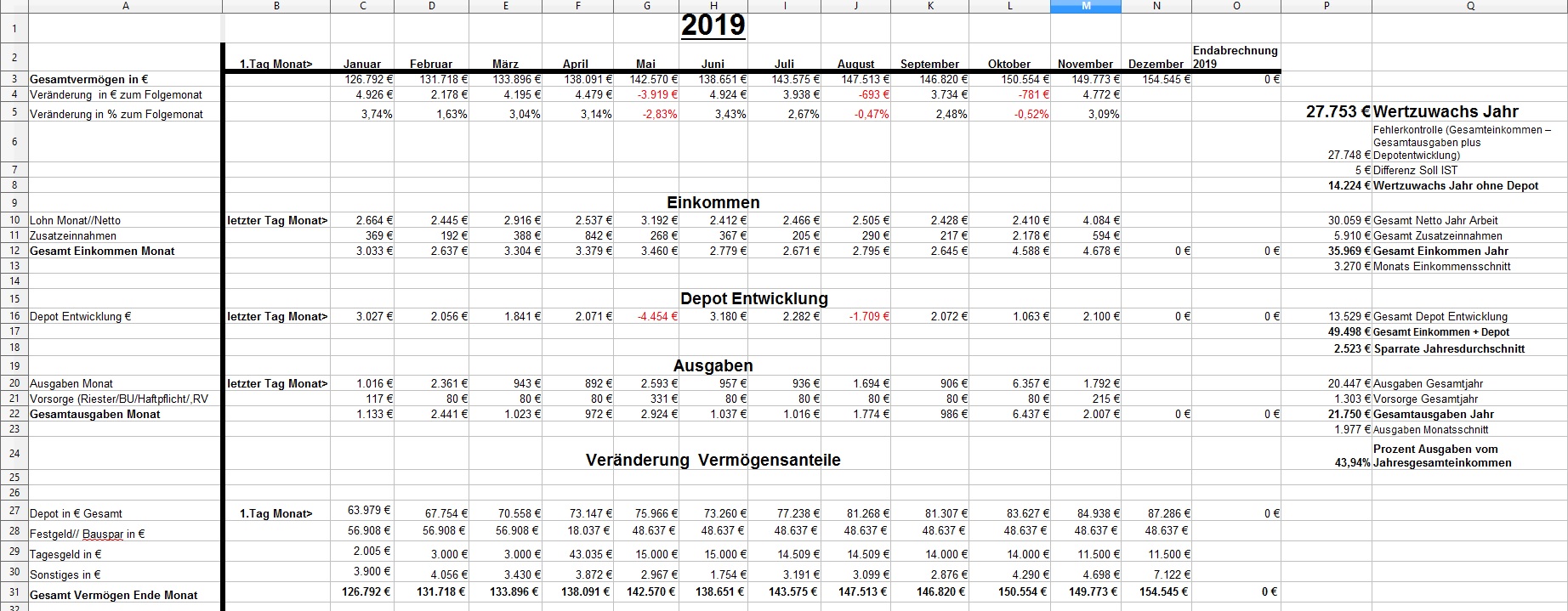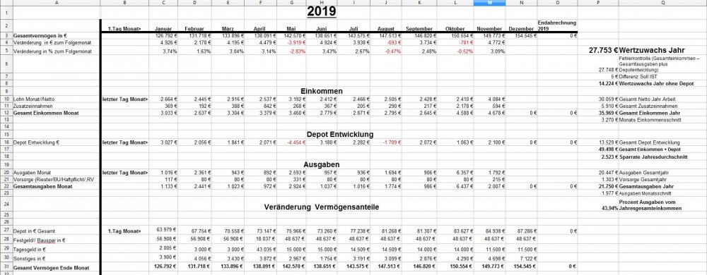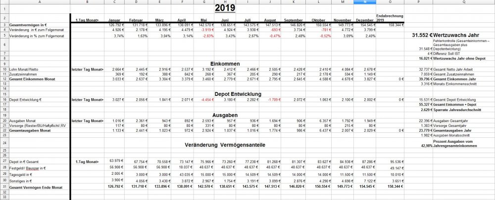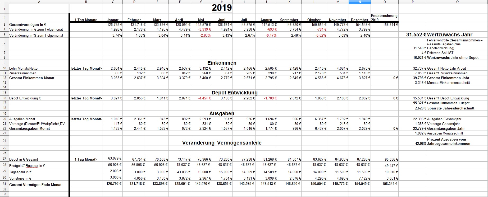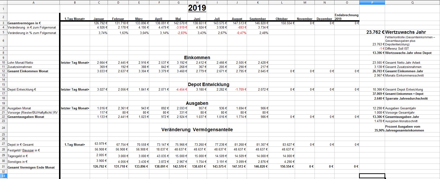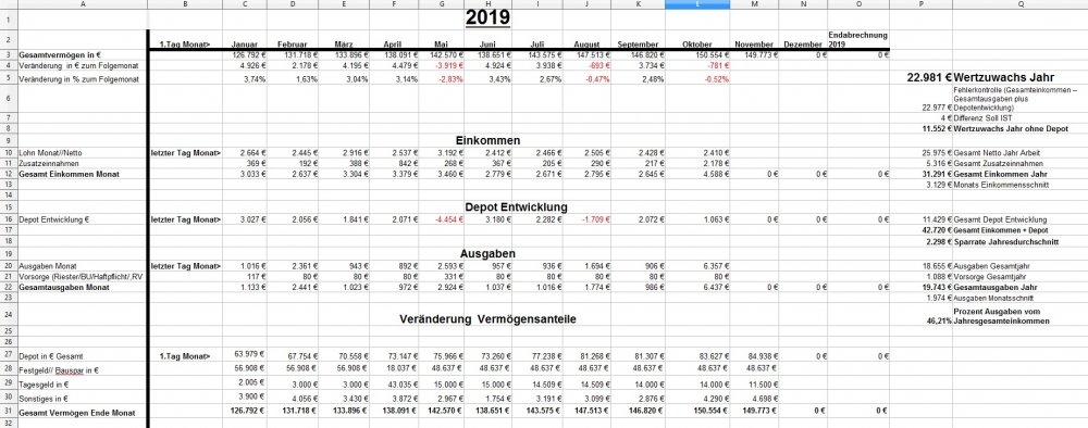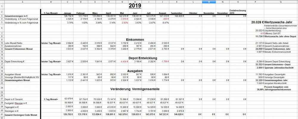 *Teufel* Januar 2, 2020 · bearbeitet Januar 2, 2020 von *Teufel* am 01.01.2020 +3799€ ist das "Vermögen" gewachsen auf nun 158344€ für Dezember: Positiv: Depotentwicklung 2002€ , Zinsen etc Negative: - Sonstiges: * Nun ist die Wohnung fertig:) im Dez. wurden die Grundmöbel fürs Kinderzimmer besorgt. (Ausgaben für die Neue Wohnung Gesamt ca 6k) im Ganzen bin ich sehr zufrieden Für 2019 Ein gutes Jahr. Wie ich am 01.01.19 vorausgesehen habe.... war das Jahr (Umzug, Famielenplanung). 2019 war mit 31552€ Gesamt Plus extrem gut. Das Plus stammte zu (16021€) von meiner Sparrate und 15531€ von der Börsenentwicklung. Hohe Ausgaben für 2019 von 23779€ waren die Folge von Umzug (6k) Fernreise und einen Autounfall. 2020 Es wird spannend.... Wie wird es sein? Ich ein Vater? Ich hoffe das alles normal läuft und wir Beide bald zu dritt sehr glücklich werden. Es ist für 2020 nicht viel geplant ,nur kleine Urlaube und erstmal klar kommen mit der neuen Situation. *Es stehen viele Themen an: Mutterschaftsgeld, Elterngeld, Kindergeld..... Testament, Vorsorgevollmacht etc... *Aus Fehlern lernt man: Neue KFZ-Versicherung mit einen Freischaden, dazu eine neue Haftpflichtversicherung(mit Forderungsausfalldeckung). Geld//Steuern//Abgaben: Grundfreibetrag + 240€, und der Steuertarif wird etwas nach rechts verschoben dazu sinkt die Arbeitslosenversicherung um 0,1%. (bei mir blebt der GKV-Zusatzbeitrag gleich). Arbeit: *bei uns geht befristet die Produktion hoch = 100-150€// Monat mehr *Lohnerhöhung von 1,5% ab Juli ,dazu eine Einmalzahlung von ca 5% im März und nochmal 9% oder 2 Tage mehr Frei in 2020. Ausgaben für 2020: Im Ganzen würde ich gerne nicht mehr wie 18000€ Gesamtausgaben in 2020 haben. 2021 Ich sehe schon jetzt Schwarz.... Ich in Elterngeld.... meine Frau ohne Nebenjob(+500€ mehr Ausgaben für mich) dazu Kita -Kosten von 300€ und Ausgaben fürs Kind... (Und das auch nur falls wir passend den Kita-Platz bekommen) sonst geht es für mich in Elterngeldplus:/ Der Blog in dieser Form endet hier. Ich werde nur noch den Jahresabschluss bringen bzw wenn es um Anlageideen geht. Diesen Beitrag teilen Link zum Beitrag