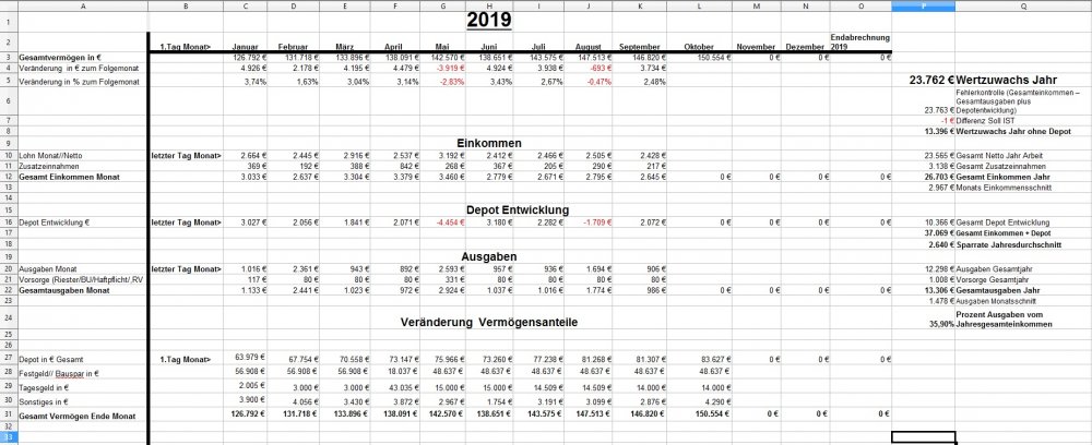 *Teufel* Oktober 13, 2019 · bearbeitet Oktober 13, 2019 von *Teufel* am 01.10.2019 +3734€ ist das "Vermögen" gewachsen auf nun 150554€ für September: Positiv: Depotentwicklung 2072€ und geringe Ausgaben 986€ Negative: - Sonstiges: * kurzfristig über 150k bevor bei mir größere kosten anlaufen * es dürfte das letzte mal in mein Leben gewesen sein ,das ich unter 1k Gesamtkosten für einen Monat lag. * der Monatsabschluss ist zum 28.09. gezogen wurden mit den Börsenkursen von dort (wegen Urlaub Rhodos) * eine Wohnung ist gefunden wurden zu knapp 575€ Warm 3 Raum Sonstiges Allgemein: zur Wohnung: *da ich mich ja nicht durchsetzten konnte mit den Ziel länger in der 2 Raum zubleiben ,läuft alles schneller an (Kind bleibt ja im Elternschlafzimmer ca 6 Monate....) (ich habe nach etwas Streit durchgesetzt das ich das Halbe Kinderzimmer für mein Sport bekomme) (befristet bis Oktober 20) * Ich hätte meine alte Wohnung nicht gleich Kündigen sollen ,so hatten wir Stress.... und haben uns nur 3 Wohnungen angesehen (später hab ich endeckt das ich (ohne Wohnberechtigungsschein) auch welche für 500€ Warm finden konnte...) * ein Umzug mit 1 Monat überlappung war viel zulang geplant ,für eine kleine Wohnung zum umziehen (denke ich zurzeit) * da meine Frau nicht campen wollte und eine Küche eher braucht (wird das ganze teuerer als gedacht) ebay Kleinanzeigen war nichts passendes drin.... * zu den 65m2 für uns dürfte es eine Verbesserung sein( Neu renoviert und wohl mal Wärme gedämmt) (jetzt war es im Sommer bis 29Grad.... und im Winter war die Heizungsluft schneller draußen als drinnen....) = Heizdecke für die Frau problem gelöst. es wird also mal eine bessere Überwinterung ^^ ( zurzeit denke ich der ganze Umzug wird auf ca 7,5k gehen) (eigentlich wollte ich den Blog einstellen oder einschlafen lassen bzw Jahresabschlüsse nur noch bringen. das ganze ist ja doch ein Risiko hier für meine Familie) Diesen Beitrag teilen Link zum Beitrag