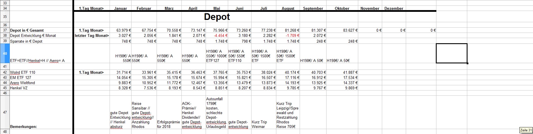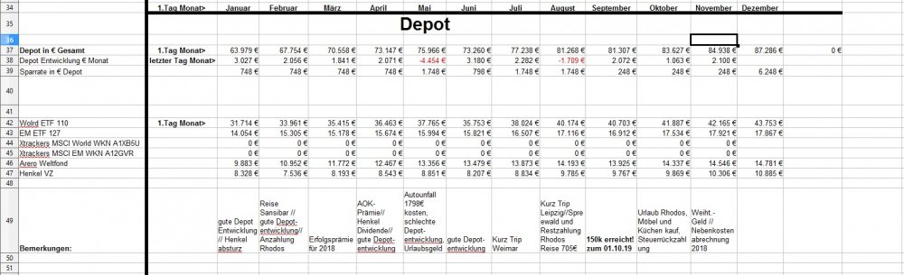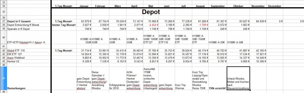*Teufel* November 4, 2019 · bearbeitet November 30, 2019 von *Teufel* am 01.11.2019 -781€ ist das "Vermögen" geschrumpft auf nun 149773€ für Oktober: Positiv: Depotentwicklung 1063€ , Steuerrückzahlung 1693€, Zahlung Reiseguthaben 100€ etc = hohe sonstige Einnahmen von 2178€ Negative: hohe Ausgaben von 6437€ : durch Urlaub Rhodos 650€, Ausgaben für neue Wohnung Möbel (A+V) / Küche 3410€ und 800€ Kaution und das ich zurzeit 2 Mieten zahle 575€+ Standartausgaben von ca 1000€ Sonstiges: Urlaub Rhodos 8 Tage mit Frühstück * war alles ganz super:) gutes Wetter und viel gesehen *ein kleines Eerdbeben gabe es auch noch dazu^^ 5,1 Stark. Umzug * nach den Urlaub fing der ernst des Lebens an... Möbelkauf und eine Küche musste besorgt werden (da aber unser Wasseranschluss schlecht lag.... war es mit der Küche (1748€) recht schwierig = 11Wochen Campen ohne Küche. (neu hab ich uns ein A+++ Kühlschrank gegönnt für 333€ ,auch wurde der Waschtrockner ausgetauscht (415€) (A Gerät) *Umzug selber hab ich deutlich unterschätzt....was doch alles zu machen ist >>> in der Regel wird alles teuerer = Regel ist weich laut Anwalt = alle Schönheitsreparaturen für mich (alt Wohnung....) * auch haben wir einen Mottenbefall festgestellt in der Abstellkammer + Lebensmittel= viel weggeworfen bzw in die Gefriertruhe Alltag: nur noch Stress wegen dem Umzug wobei ... wenigstens läuft die Schwangerschaft bis jetzt ohne Probleme:) Diesen Beitrag teilen Link zum Beitrag