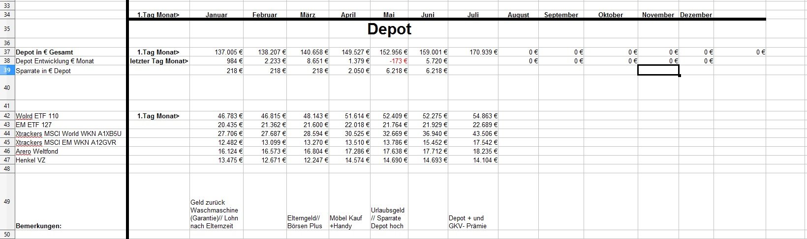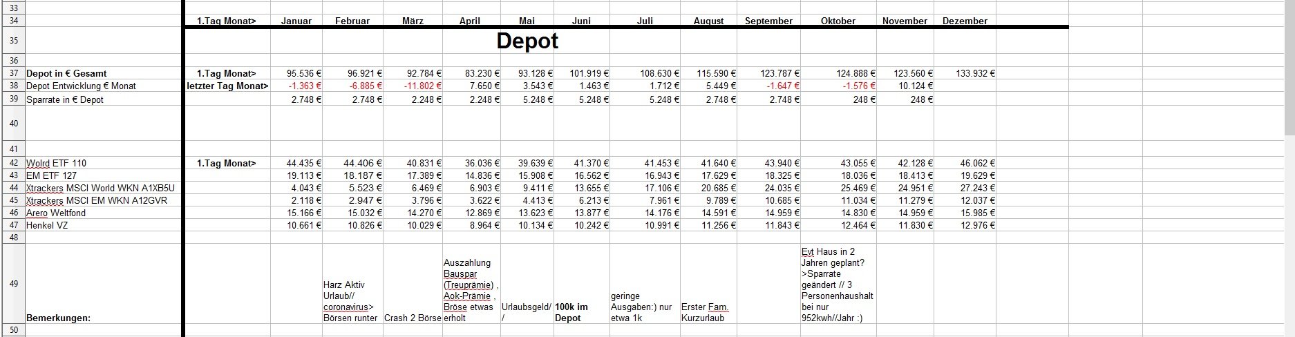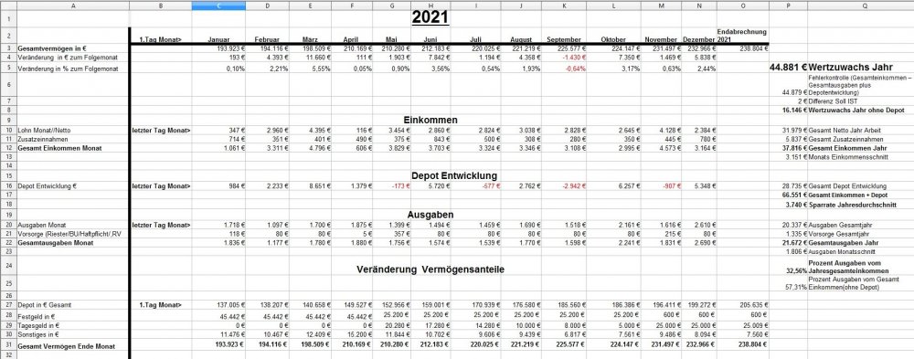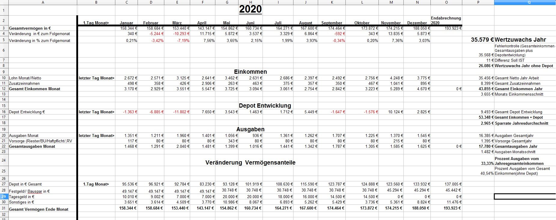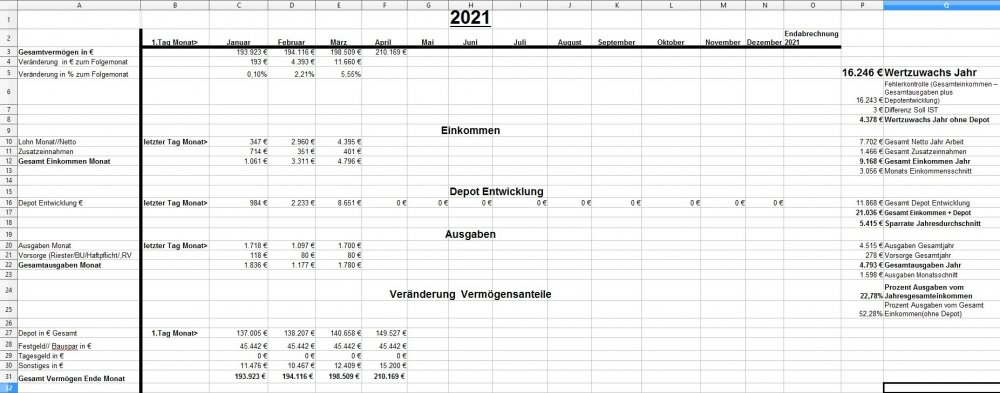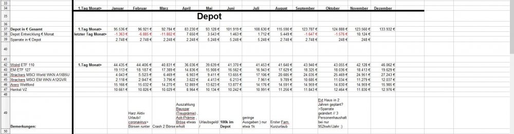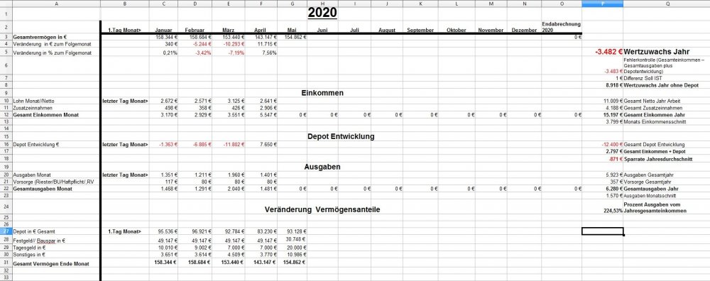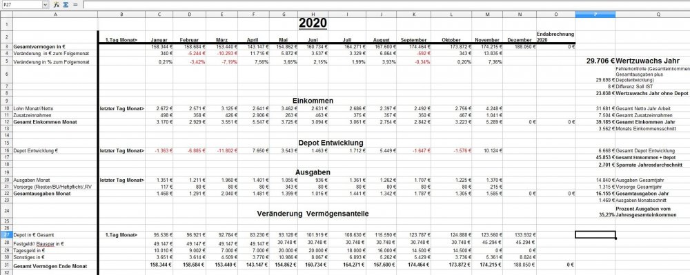 *Teufel* Dezember 18, 2020 · bearbeitet Dezember 18, 2020 von *Teufel* Heute am letzten Tag meiner Quarantäne mache ich einen Rückblick auf das Jahr 2020 unter den Stern von Corona (offtopic) Januar und Febuar liefen wie geplant Ende Febuar waren wir noch mal auf Firmenkosten im Harz zu unsern Aktive Tagen , meine Hochschwangere Frau hat das wirklich noch gut mit gemacht^^ Corona war noch weit Weg... selbst wenn die Börsen schon mal abwärts gingen. März Ich wurde Vater:) und Corona war Top Thema.....auch an der Börse... Meine Frau war im März schon im Mutterschutz und nicht mehr auf Arbeit im Krankenhaus(Glück gehabt) Corona hat dafür gesorgt das es keine Geburtsvorbereitungskurs gab und das ich zwar bei der Geburt dabei war ,aber nicht mehr Besuchen drufte. Auch konnten wir unsern Sohn nicht so wirklich der Familie vorstellen. April Da meine Frau im Elternzeit war musste sie weder Arbeiten noch Studieren, Mai,Juni, Juli, August liefen dann fast wieder Normal ab Ich war Arbeiten und und unsere Anlagen waren voll ausgelastet. Ab Juli ging unsere Auslastung dann zurück und wir waren in Teilkonti (etwa 200-300€ // je Monat weniger) und auch mal 2 Tage Überstunden abfeiern.... (keine Kurzarbeit) September: Corona war zur der Zeit wieder nicht mehr ganz so Wichtig und wir haben ohne Probleme unsern Famielenurlaub gemacht.(7Tage Hausboot) ab Oktober: ? Alle sind in Kurzarbeit? aber wir drehen die Produktion wieder auf Max? November: Alles läuft wieder Rund Weihnachtsgeld die Börsen haben sich gut erholt Mein Sohn lacht viel und erkundet die Welt mit ersten Sitz und Krabbel versuchen. Für meine Frau läuft auch wieder fast alles normal:) nur das ihre ganzen Babykurs auf Zoom waren bzw (Babyschwimmen abgesagt wurden) Dezember Ich gehe Arbeiten bis ich nicht mehr durfte... Quarantäne ,ich hatte wohl auf Arbeit Kontakt zu einen positiven ,aber durch Glück bin ich negative und hab einfach Freizeit. Nun hoffe ich auf Weihnachten und eine entspannte Elternzeit im Januar. Meine Frau hat für irhen heldenhaften Einsatz als Krankenschwester einen Coronabonus bekommen? Im Ganzen war ich sehr Zufrieden wie 2020 ablief:) Es war gut das wir in 2019 Umgezogen waren und 65m2 haben gelangt:) Auch konnte ich mein Sportraum// Kinderzimmer bis jetzt behalten *freu* im Januar fliege ich nun wirklich raus:/ auch sieht es nicht so aus als könnte ich im Januar kein Kurzurlaub machen. 2020 Was war überraschend: *Das das Arbeitsamt meiner Frau eine Aufstockung aufs Elterngeld einmalig gezahlt hat (ohne je einen Brief zuschreiben?) * Coronabonus Kindergeld (300€) * Das Elterngeld vorschüssig gezahlt wird..... und mein Lohn am Monatsende = Dezemeber viel Geld und dann bis Febuar warten *toll* *Wie wenig Elterngeld ist.... da wird ja alles abgezogen *Coronabonus Frau? für was? Was Lief wie geplant? *Es sieht so aus als komme ich mit 1,5k Ausgaben im Monat hin. *Kleine Kinder kleine Sorgen. (war genau so günstig wie gedacht.) *Urlaub konnten wir alles wie geplant machen. *Die Auzahlung von meinen Bausparvertag mit Treueoption *Kaution und Nebenkosten Plus aus der alten Wohnung ist nun angekommen:) (Glück gehabt da hatte ich viel schaden gemacht^^) *Für die neue Wohnung konnte ich nur durch ein Anruf Fehler (Nachzahlung) beheben Für 2021 sehe ich aber weiterhin schwarz Anhang Übersicht bis November Diesen Beitrag teilen Link zum Beitrag