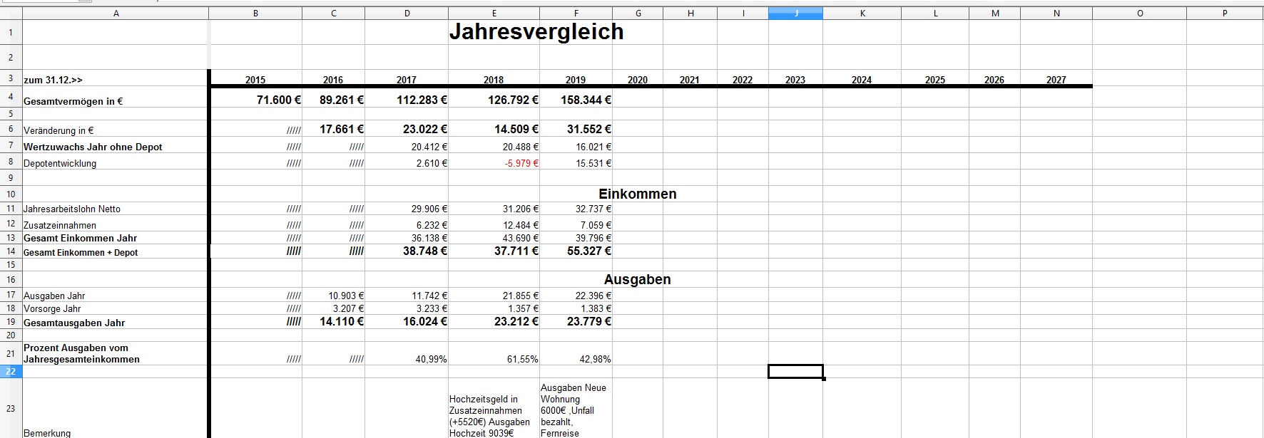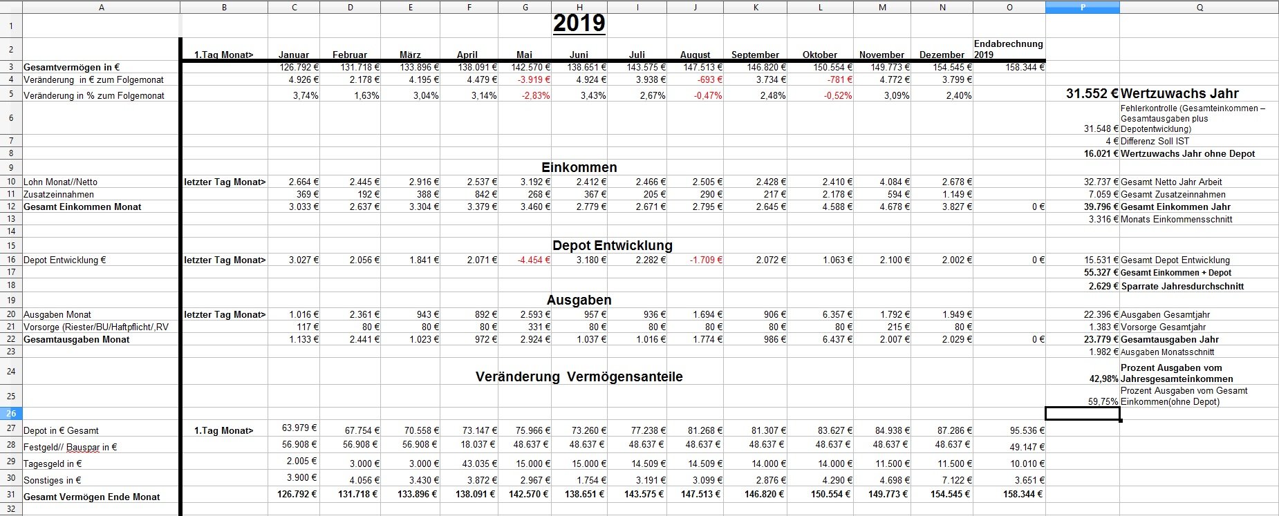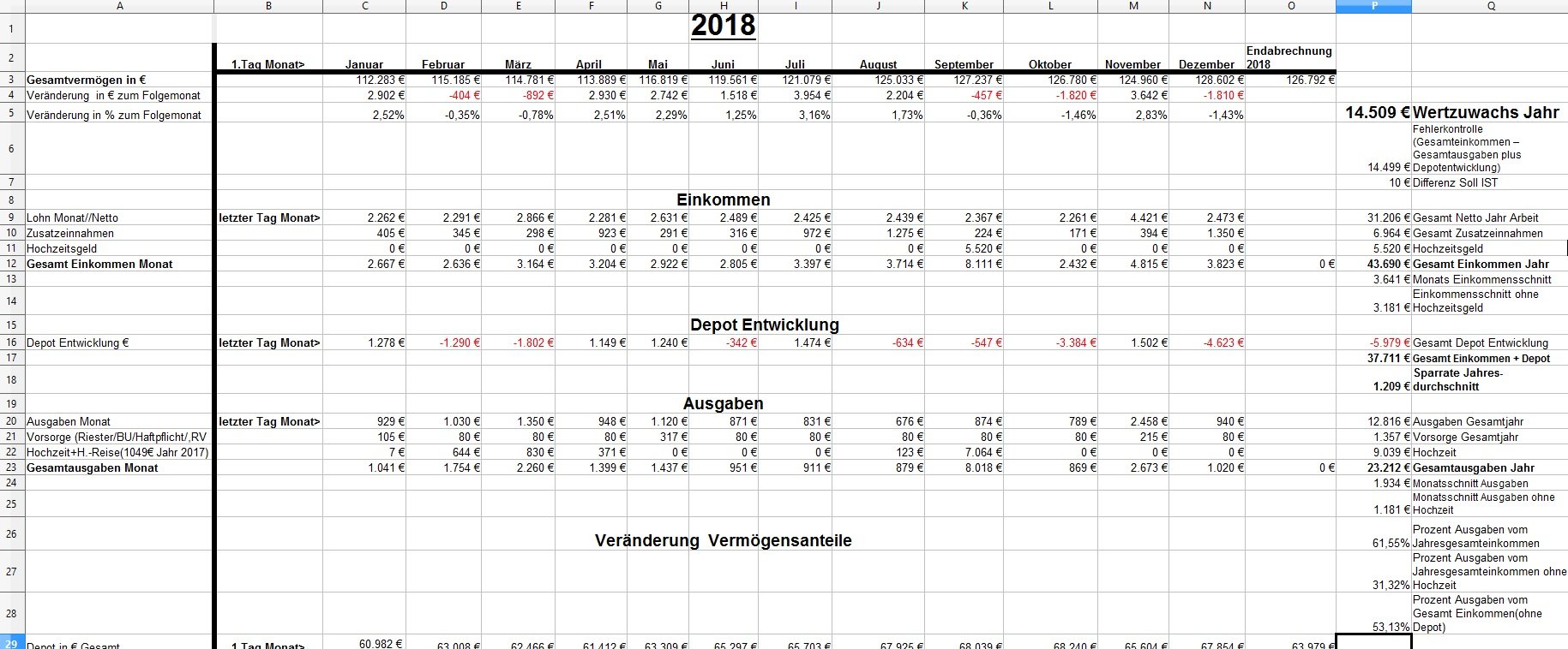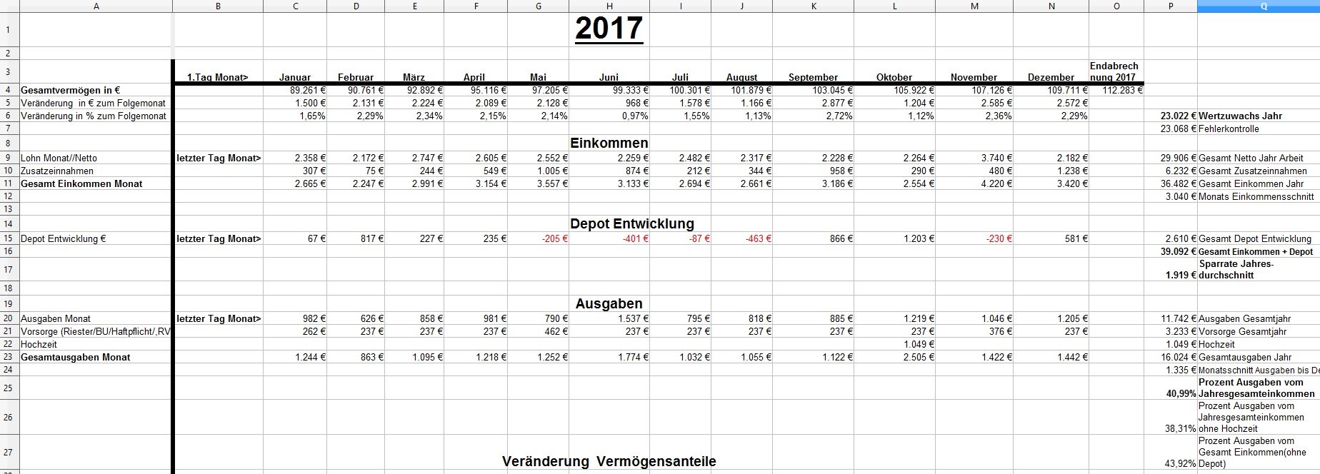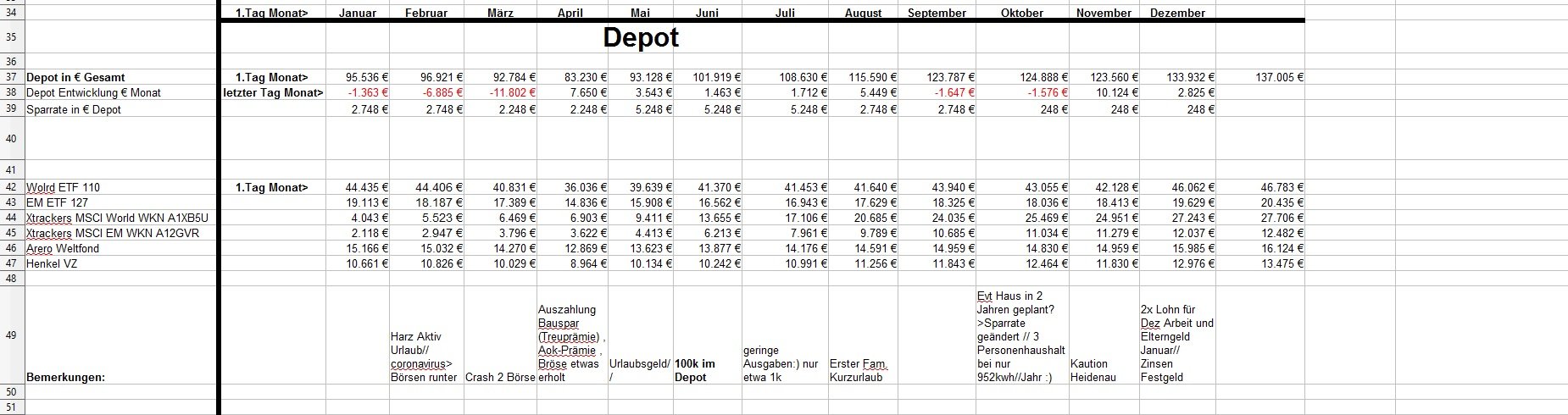 *Teufel* Dezember 18, 2020 · bearbeitet Dezember 18, 2020 von *Teufel* Heute am letzten Tag meiner Quarantäne mache ich einen Rückblick auf das Jahr 2020 unter den Stern von Corona (offtopic) Januar und Febuar liefen wie geplant Ende Febuar waren wir noch mal auf Firmenkosten im Harz zu unsern Aktive Tagen , meine Hochschwangere Frau hat das wirklich noch gut mit gemacht^^ Corona war noch weit Weg... selbst wenn die Börsen schon mal abwärts gingen. März Ich wurde Vater:) und Corona war Top Thema.....auch an der Börse... Meine Frau war im März schon im Mutterschutz und nicht mehr auf Arbeit im Krankenhaus(Glück gehabt) Corona hat dafür gesorgt das es keine Geburtsvorbereitungskurs gab und das ich zwar bei der Geburt dabei war ,aber nicht mehr Besuchen drufte. Auch konnten wir unsern Sohn nicht so wirklich der Familie vorstellen. April Da meine Frau im Elternzeit war musste sie weder Arbeiten noch Studieren, Mai,Juni, Juli, August liefen dann fast wieder Normal ab Ich war Arbeiten und und unsere Anlagen waren voll ausgelastet. Ab Juli ging unsere Auslastung dann zurück und wir waren in Teilkonti (etwa 200-300€ // je Monat weniger) und auch mal 2 Tage Überstunden abfeiern.... (keine Kurzarbeit) September: Corona war zur der Zeit wieder nicht mehr ganz so Wichtig und wir haben ohne Probleme unsern Famielenurlaub gemacht.(7Tage Hausboot) ab Oktober: ? Alle sind in Kurzarbeit? aber wir drehen die Produktion wieder auf Max? November: Alles läuft wieder Rund Weihnachtsgeld die Börsen haben sich gut erholt Mein Sohn lacht viel und erkundet die Welt mit ersten Sitz und Krabbel versuchen. Für meine Frau läuft auch wieder fast alles normal:) nur das ihre ganzen Babykurs auf Zoom waren bzw (Babyschwimmen abgesagt wurden) Dezember Ich gehe Arbeiten bis ich nicht mehr durfte... Quarantäne ,ich hatte wohl auf Arbeit Kontakt zu einen positiven ,aber durch Glück bin ich negative und hab einfach Freizeit. Nun hoffe ich auf Weihnachten und eine entspannte Elternzeit im Januar. Meine Frau hat für irhen heldenhaften Einsatz als Krankenschwester einen Coronabonus bekommen? Im Ganzen war ich sehr Zufrieden wie 2020 ablief:) Es war gut das wir in 2019 Umgezogen waren und 65m2 haben gelangt:) Auch konnte ich mein Sportraum// Kinderzimmer bis jetzt behalten *freu* im Januar fliege ich nun wirklich raus:/ auch sieht es nicht so aus als könnte ich im Januar kein Kurzurlaub machen. 2020 Was war überraschend: *Das das Arbeitsamt meiner Frau eine Aufstockung aufs Elterngeld einmalig gezahlt hat (ohne je einen Brief zuschreiben?) * Coronabonus Kindergeld (300€) * Das Elterngeld vorschüssig gezahlt wird..... und mein Lohn am Monatsende = Dezemeber viel Geld und dann bis Febuar warten *toll* *Wie wenig Elterngeld ist.... da wird ja alles abgezogen *Coronabonus Frau? für was? Was Lief wie geplant? *Es sieht so aus als komme ich mit 1,5k Ausgaben im Monat hin. *Kleine Kinder kleine Sorgen. (war genau so günstig wie gedacht.) *Urlaub konnten wir alles wie geplant machen. *Die Auzahlung von meinen Bausparvertag mit Treueoption *Kaution und Nebenkosten Plus aus der alten Wohnung ist nun angekommen:) (Glück gehabt da hatte ich viel schaden gemacht^^) *Für die neue Wohnung konnte ich nur durch ein Anruf Fehler (Nachzahlung) beheben Für 2021 sehe ich aber weiterhin schwarz Anhang Übersicht bis November Diesen Beitrag teilen Link zum Beitrag