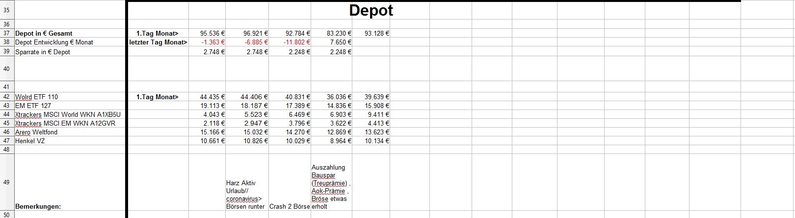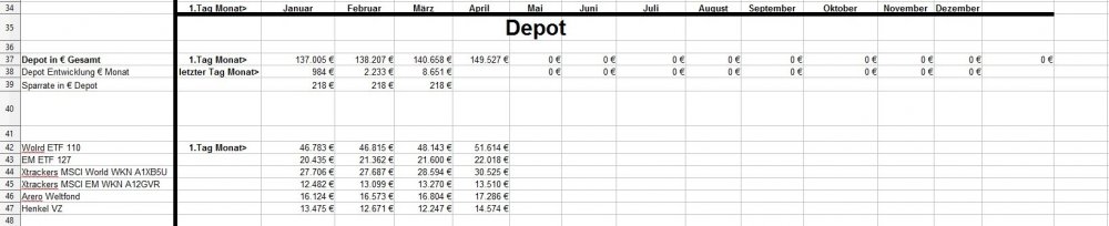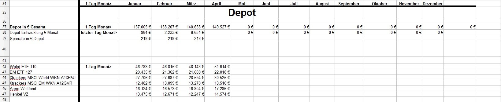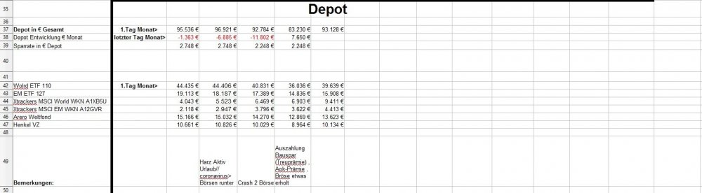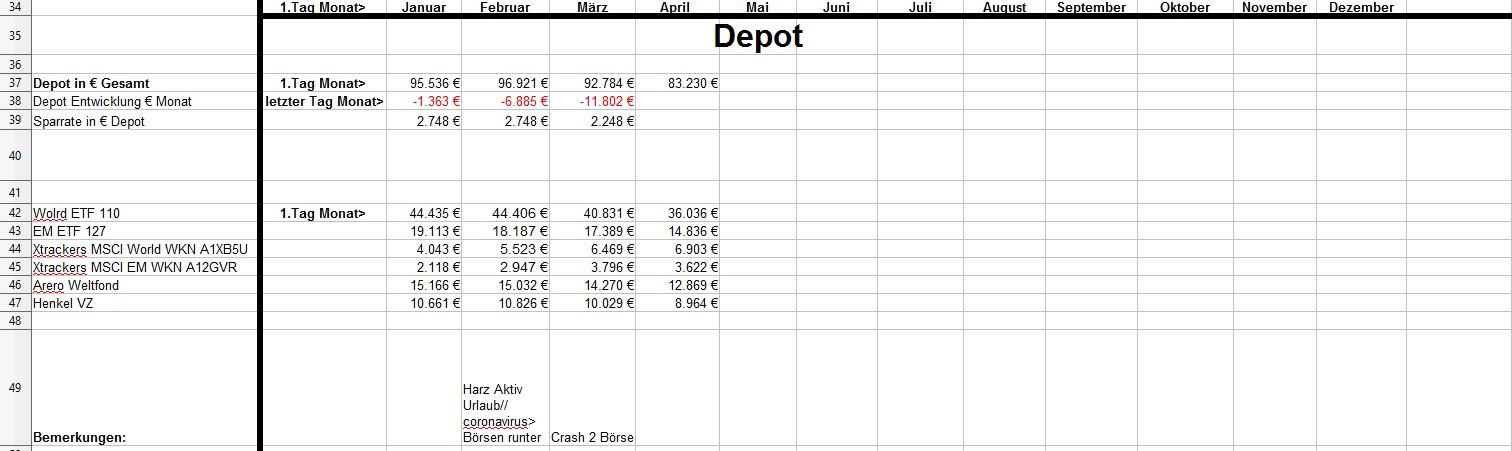 *Teufel* Mai 2, 2020 zum April: Es ist für mich nicht mehr durchschaubar wohin die Reise geht^^ +11715€ in einen Monat und damit weit mehr wie jemals zuvor (vorher max 5k in einen Monat) ( Plus Depot-Plus von 7650€ + hohe sonstige Einkommen (2,9k) und geringe kosten für April. *da mein Bausparer nun ausbezahlt wurde ,habe ich etwas Cash und gehe mit 5250€ die nächsten Monate rein. ( ETF World 3,5k und EM 1,5k, Henkel 198€, Arero 50€) * Ziel ist es nur noch 30k zu halten mit Tages und Festgeldern (zurzeit 50,7k) * meine Persönlichen kosten von 1,5k im Monat werde ich vermutlich nicht ganz schaffen (zurzeit 1570€ Schnitt und es kommen noch die Stuernachzahlung.... (denke mal 1k durch Steuerklasse 3) und unser kleiner Urlaub ca 1k ende des Jahres.... wie geht es mit Corona und der Welt weiter? Kein Plan..... aber was ist schon Planbar? Ich lebe zurzeit einfach so normal wie möglich weiter und denke mir es wird schon alles gut gehen. Diesen Beitrag teilen Link zum Beitrag