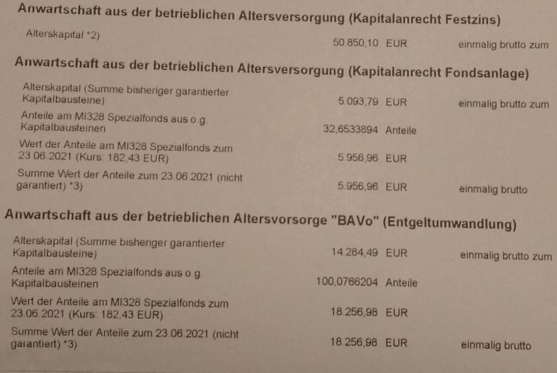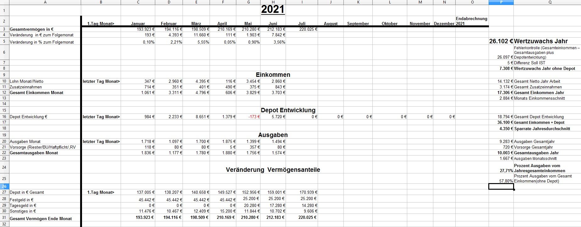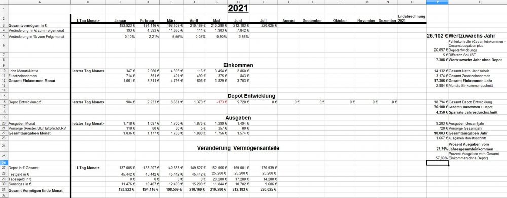 *Teufel* Juli 2, 2021 · bearbeitet Juli 2, 2021 von *Teufel* Mal wieder ein Update: Zum 01.07.2021 3 Monate sind nun wieder rum und es ist einiges passiert: Zurzeit stehen etwa 220k in den Büchern und damit ein dickes Plus von 26k für 2021 Ich bewege mich immer noch bei einer Sparqoute (ohne Depot) von 42% und das bei 2 Monaten mit weniger Geld (Elternzeit). Uns geht es soweit ganz gut: >>> und es läuft alles ( Kita Uni Arbeit etc ),leider bin ich nun auch schon 35 Jahre ... und mein Geb. wurde nicht gefeiert da meine Mutter ein Schlaganfall kurz voher hatte :/ es ist so weiter wieder alles gut >>> leider wurde dabei auch noch ein Aneurysma bei ihr im Kopf festgestellt. *ich mache mir sorgen* und hoffe es wird alles wieder bei meinen Eltern. (Vater ist nun ja auch schon 85....) Ich lege mich fest bis 70 werde ich nicht arbeiten! (heute gibt es dazu also noch ein Kassensturz was die AV-betrifft) Sonstiges: *Sparplan zurzeit 6218€//Monat *ab Juli gibt es 1,3% mehr Lohn. *ab August gehe ich nicht mehr jeden Sontag arbeiten (ca 250€ Netto sind damit erstmal weg) * Ich kann mich weitere 3 Monate um die Steuererklärung drücken Top (erwarte da 2-2,5k Nachzahlung...) Altervorsorge: *Rentenpunkte bis Juli 20 >> 13,7 Punkte Private Vorsorge: RV ist etwa 3k Wert und ist aus 2003 >>>zurzeit zahle ich da 270€//Jahr ein bei 5% Dynamik die ich nur noch 10 mal nutzen werde>>>Abschlusskosten >>>Zahlpunkt ist schon der 60 Geb. *Riester lohnt sich nicht für mich und steht bei 13k Wert (DWS Top-Rente Dynamik) und zahle i5€ Monat ein >>>>ich habe noch nicht mal mein Kind angeben weil ich nicht weis was ich damit noch machen werde? Betrieb: *50,8k stehen jetzt schon fest 2053 bzw falls ich voher sterbe. >>die Werte können noch steigen: *18k ist meine BAVO zurzeit Wert *6K stehen in der betrieblichen AV * 8,5k stehen im ChemiePensionsfonds Evt, gibt es noch mal ein paar K aus den Überschüssen aus meiner BU über den Betrieb. = 100k ob das gut oder schlecht ist weis ich natürlich nicht. Diesen Beitrag teilen Link zum Beitrag