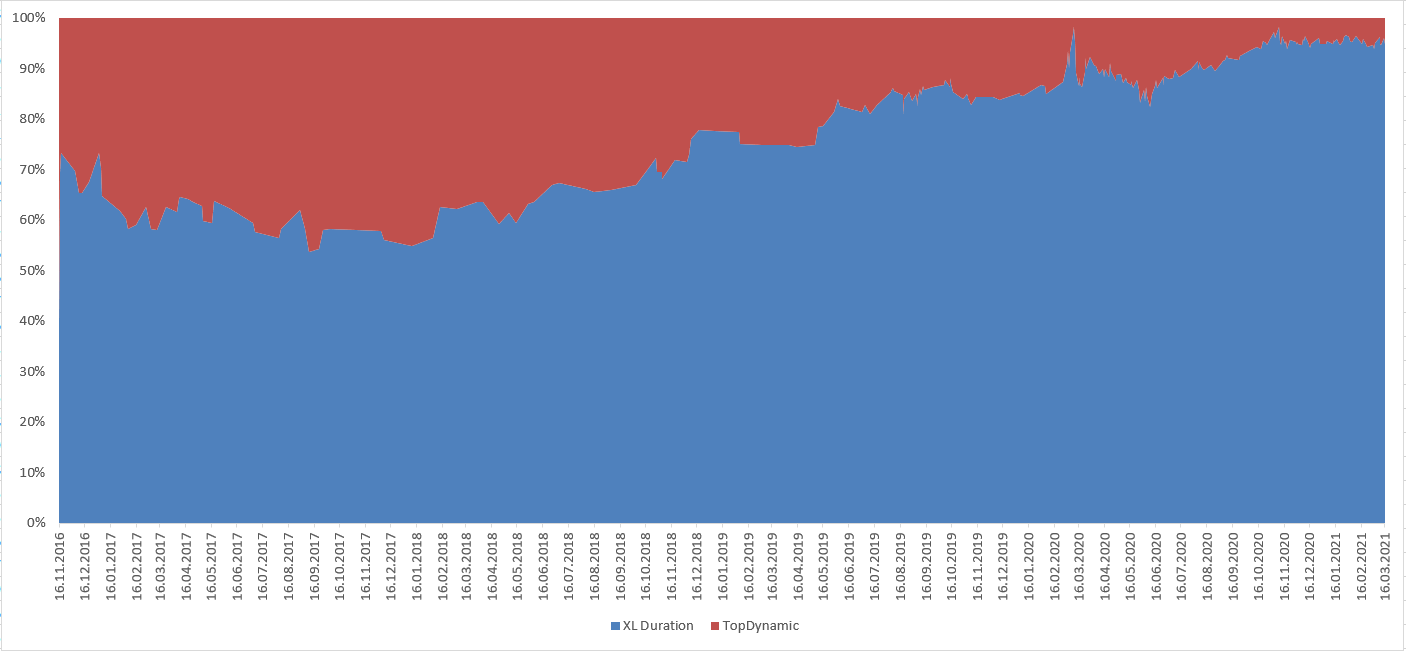 Über die Laufzeit habe ich das Verhältnis (in%) zwischen Rentenfonds und Aktienfonds visualisiert. Man erkennt klar und deutlich, dass der Rentenanteil klar überwiegt und zwar schon immer.