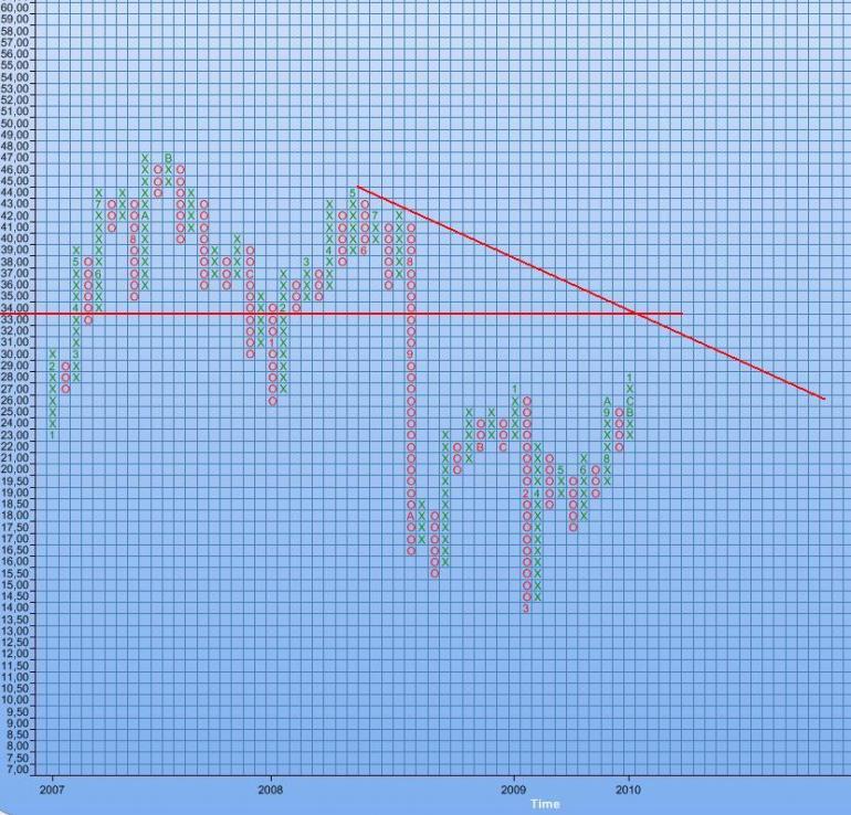 Die unterschiedlichen Kursziele ergeben sich aus der Skalierung sowie dem Charttyp. Ich benutzte meist eine logarithmische oder lineare Skalierung mit der Candlestick-Darstellung. Außerdem setzt du deine Linie auch ganz anders als ich. Ausgangspunkt bei mir ist das Top aus 2007. Würdest du das auch machen, ergäbe sich nach deiner Methode sogar noch ein deutlch höheres Kursziel als 34. Die P&F Methode wir doch heutzutage kaum mehr verwendet. Nutze doch lieber die gängigen Chartdarstellungen.