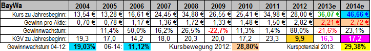 Das 2012er-Ergebnis je Aktie steigt dadurch von 1,48 Euro auf 2,82 Euro, bei einem aktuellen Kurs von 36 Euro ergibt dies ein trailing KGV von 12,8. Die Dividende wird auch in diesem Jahr wieder von 0,60 Euro auf 0,65 Euro erhöht.