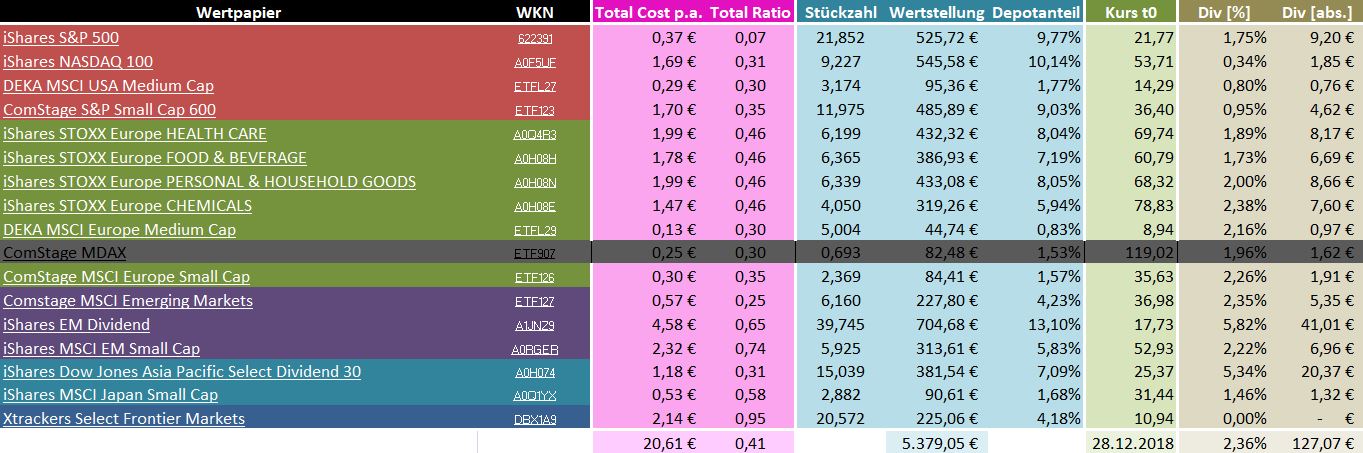 Wenig fachmännisch habe ich die in den vergangenen 30 Tagen nachgekauften Papiere markiert, wobei wie bereits erwähnt der iShares Stoxx Europe Personal & Household Goods-ETF dabei außen vor gelassen werden muss. Hier habe ich dem S & P 500 aufgrund der regionalen Verteilung den Vortritt gelassen.