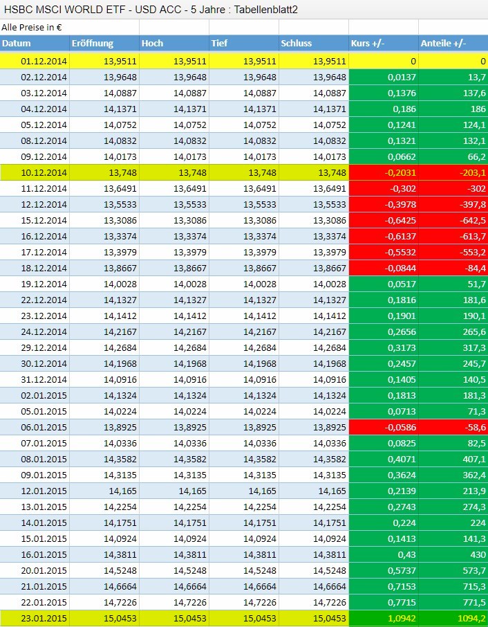ebody Mai 5, 2018 Hallo, ich habe hier eine Tabelle erstellt, die die Kurs Entwicklung eines ETF der (fast) letzten 5 Jahre zeigt und der entsprechenden Entwicklung meiner Anteile, die ich in diesem Beispiel am 01.12.2014 gekauft habe. Ich möchte das gerne als Grundlage nehmen um Stück für Stück zu verstehen, wie man mit einem ETF Geld verdienen oder verlieren kann. Ich habe vieles noch nicht verstanden, speziell nicht, warum fast immer geraten wird, das ETF´s immer mind. 10 Jahre, am besten länger gehalten werden sollten. Die Spalte "Anteile +/-" der Tabelle zeigt, wie ich sozusagen die Grundlage verstehe, wie mit ETF´s Geld verdient oder verloren werden kann. Ich kaufe am 01.12.2014 1000 Anteile für je 13,9511€. Mein ETF Depot hat zu diesem Zeitpunkt einen Gesamtkurswert von 13.951,10€. Ab diesem Zeitpunkt entscheidet der Kursverlauf, ob mein Depotwert über oder unter dem Einstiegswert liegt und ob ich Gewinn oder Verlust mache. Beispiel: Am 10.12.2014 hätte ich einen Verlust von 203,10€ Am 23.01.2015 einen Gewinn von 1094,20€ Ist das soweit erstmal richtig? Nur auf diese Möglichkeit bezogen Gewinn/Verlust zu machen, verstehe ich nicht, warum eine lange Anlagedauer von Vorteil ist? Wenn ich z.B. am 23.01.2015 Gewinn gemacht habe und verkaufe meine Anteile nicht, wird der Kursgewinn ja nicht dafür verwendet weitere Anteile zu kaufen oder? Somit hätte ich dann auch keine Chance durch mehr Anteile mehr Gewinn zu machen. Ich könnte die Anteile verkaufen und mit dem Gewinn wieder mehr Anteile kaufen, aber das versteht man doch nicht unter "langfristig anlegen" oder? Was bedeutet dann "thesaurierend" in diesem Zusammenhang, also welcher Gewinn wird wieder reinvestiert, wenn ich meine Anteile nicht verkaufe? Es gibt ETF´s, die Dividenden ausschütten, was aber keine Garantie ist, dass das passiert?! Wenn Dividenden ausgeschüttet werden, könnten diese reinvestiert werden? Gibt es auch einen Zinseszins Effekt bei ETF´s? Wenn ja, bei allen ETF´s? Dann könnte der reinvestiert werden? Gibt es sonst noch etwas was reinvestiert werden kann, wenn man einen thesaurierenden ETF hat? Gruß ebody Diesen Beitrag teilen Link zum Beitrag