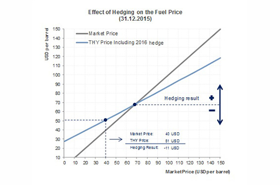 Sollte der Preis für Flugkerosin fallen, so entsteht ein Verlust aus dem Hedge und sollte er steigen so entsteht ein Gewinn aus dem Hedge.