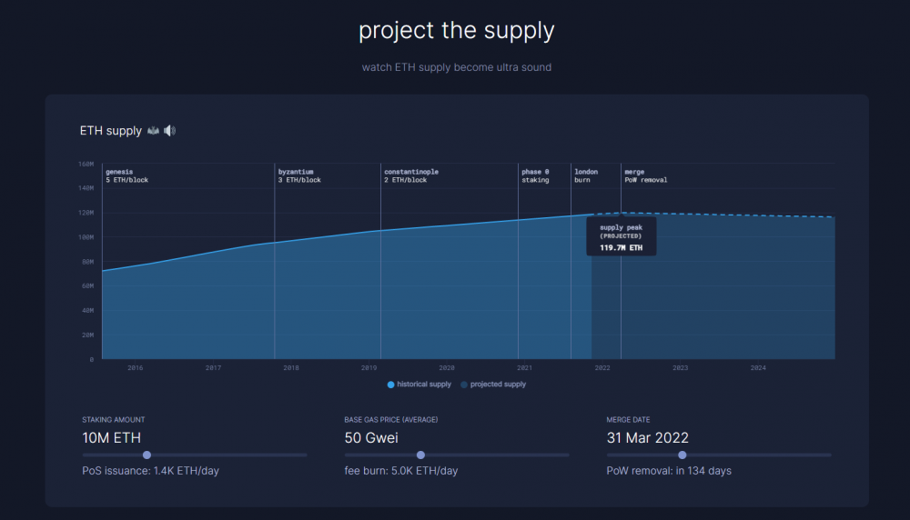 Chips November 17, 2021 · bearbeitet November 17, 2021 von Chips vor 2 Stunden von knusperente: Auch interessant: ultrasound.money bietet ein Prognosetool welches unter verschiedenen Konditionen die Supply prognostiziert. Mit 10M Eth im Staking, durchschnittliche 50 Gwei pro Transaktion und dem Merge Datum (Proof-of-Stake Übergang) am 31. März 2022, sollte die Supply von Ether ab 199.7M ETH Gesamtsupply schrumpfen. Nach dem Merge wird die prognostizierte jährliche Issuance bei ca. 0,5M ETH liegen (im Vergleich: bisher sind es 5,4M ETH pro Jahr). Durch den Burn-Mechanismus wird ein Teil von Ether aber noch zusätzlich verbrannt. Die Idee ist, dass die Ether-Supply bei wenig Bedarf nach Transaktionen steigt und bei hohem Bedarf nach Transaktionen sinkt. Durch den Fee-Burn Mechanismus (EIP-1559) wird dies automatisch gesteuert. Ua. auch wegen solchen Seiten hab ich manchmal das Gefühl, Kryptos sind nicht einfach nur da, um damit zu zocken. Da steckt wohl Einiges an Energie drin und Menschen nutzen es auch. Siehe auch hier: https://dappradar.com/rankings/protocol/ethereum Diesen Beitrag teilen Link zum Beitrag