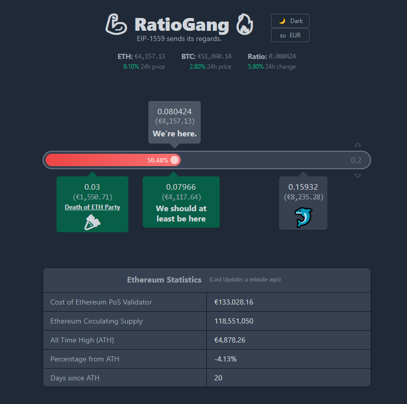knusperente November 30, 2021 · bearbeitet November 30, 2021 von knusperente Happy ETH/BTC Ratio Day (50%)! Heute ist Ether halb soviel Wert wie Bitcoin (nach Marketcap). Bei einem Ether-Preis von 8,235€ würde Bitcoin "geflipped" werden, auch genannt"The Flippening". PS: Im März 2021 wurde noch der "Tod" von Ether bei einer 0,03 Ratio von Bitcoinern gefeiert. Diesen Beitrag teilen Link zum Beitrag