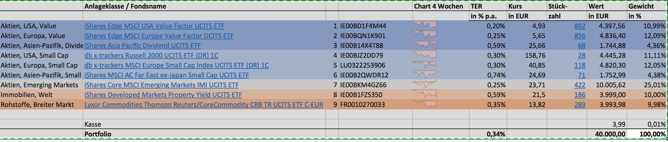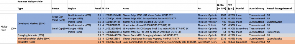 boje September 1, 2017 Hallo, habe mich gerade hier angemeldet. Ich plane ein Weltportfolio nach Kommer anzulegen. Ich habe das Portfolio aus seinem Buch versucht exakt mit aktuellen ETFs abzubilden und nicht zu vereinfachen. Ich habe also auch die Faktoren Value und Small Cap mit dabei sowie Rohstoffe und Immobilien. Bei der Auswahl der ETFs habe ich auf folgende Punkte geachtet: - TER - Größe - Möglichst physisch und nicht synthetisch - Möglichst thesaurierend und nicht ausschüttend Bei der ETF Auswahl habe ich etwa 2 h investiert und hätte gerne Eure Meinung zur Auswahl (siehe Anhang). Ich plane sehr lange zu halten. Ich denke es ist sinnvoll alles direkt zu investieren und nicht blockweise. Was meint ihr? Vielen Dank für die Einschätzung! Diesen Beitrag teilen Link zum Beitrag