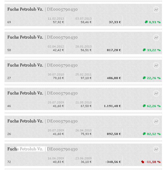 hugolee Januar 10, 2014 P.S. Wie oft hast du in all der Zeit eigentlich Fuchs Petrolub gekauft und wieder verkauft? ja ... ich hab öfter gehandelt ... das ist durch die krisenzeiten bedingt ... in solchen zeiten bin ich noch eher bereit positionen glattzustellen ... fuchs petro hab ich 5 mal gekauft und 6 mal verkauft ... warum ich da einen Teikverkauf getätigt habe weiß ich nicht das häufige kaufen ist systembedingt nicht zu vermeiden, wenn meine markteinschätzung sinkt, dann verkaufe ich die position mit der (meiner meinung nach) schlechtesten aussicht .... und wenn meine markteinschätzung wieder steigt, dann ist es oft so, dass genau dieser kandidat dann wieder ins depot kommt .... weil es eben der beste unter den schlechten ist Ich bin total froh, dass meine Füchse im Abgeltungssteuerfreien Depot liegen und ich sie daher nicht verkauft habe. Vermutlich würden meine Käufe/Verkäufe sonst ähnlich aussehen wie bei Dir. Dafür hab ich ein anderes Problem, da die Füchse aufgrund Ihrer imensen Entwicklung eine viel zu große Gewichtung in dem Depot haben. Aber das ist eine andere Geschichte. @Charti Ich finde Dein Depot gut, weil Du wirklich schon sehr lange durchhälst und uns diese Einsichten in Dein Depot ermöglichst. Das ist aller Ehrenwert und verdient wirklich RESPEKT. Weiterhin stimme ich der Kaffeetasse (was für ein Name *grins*) zu, dass es eigentlich zu viele Trades sind, die Dich Performance kosten. Natürlich hast Du das von Anfang an so Kommuniziert. Dennoch denke ich, dass Du vielleicht darüber nachdenken solltest zum Beispiel 10-20% Deines Depots fest und langfristig in Unternehmensbeteiligungen anzulegen. Durch diesen Anteil bekommst Du eventuell kontinuierliche Dividenden. Mit den Restlichen 80-90% kannst Du ja weiter verfahren wie bisher. Ich werde jedenfalls weiterhin Dein Depot verfolgen und wünsche Dir viel Erfolg Viele Grüße hugolee Diesen Beitrag teilen Link zum Beitrag