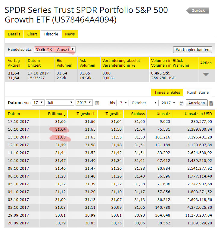 derxi Oktober 17, 2017 vor 7 Minuten schrieb Ramstein: Bei Morning Star steht für diesen ETF "SPDR® Portfolio S&P 500 Growth ETF (MXN) | SPYG". MXN heisst Mexiko und der Wertverlust ist die von Trump verordnete Abgabe, um die Mauer an der Grenze zu Mexiko zu bauen. Aber ich habe es doch nicht auf MEXICAN STOCK EXCHANGE gekauft. Ich habe es durch meine Bank von NYSE gekauft und der Kurs von dort hat keinerlei Verlust aufgewiesen: Mein Auftragsbestätigung vom Kauf: Diesen Beitrag teilen Link zum Beitrag