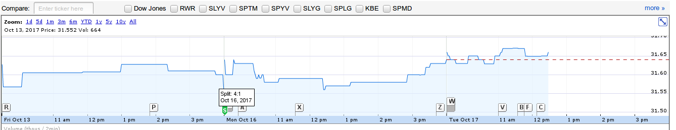 vanity Oktober 17, 2017 vor 10 Minuten schrieb alsuna: Wahrscheinlich eine blöde Anfängerfrage: Warum sieht man das nicht in den Kursen, z.B. in dem obigen Screenshot von der NYSE, bei Google oder direkt an der NYSE? Wird bei Splits der Kurs rückwirkend umgerechnet? Offensichtlich. In DE ist der Fonds in Hamburg notiert, auch dort sieht man einen "linearen" Verlauf ohne den Sprung durch den Split. (in der von kleinerfisch verlinkten Seite sehe ich allerdings auch keinen Hinweis auf den Split. Bei SPDR/SSgA hatte ich auch nichts gefunden, was aber an meiner Suchtechnik liegen kann) Diesen Beitrag teilen Link zum Beitrag