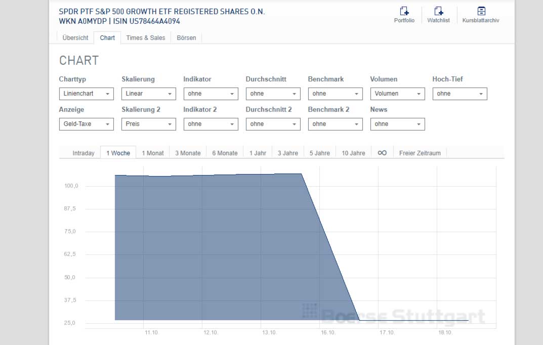 derxi Oktober 17, 2017 Hallo Forumfreunde! Ich brauche eure Hilfe...Gestern am Montag (16.10.2017) ist mein S&P 500 Growth ETF Kurs plötzlich um 75% gesunken (Markiert unten am Screenshot) und in meinem Depot ist auch dementsprchend ein Verlust aufgetaucht. Ich kenne mich da nicht mehr aus... ist es wie ein Split von Akiten? Aber warum bekomme ich die Stückzahl nicht umgerechnet? Hat jemand dasselbe ETF? Kann meinen Bankbetreuer nicht erreichen, daher poste ich es im Forum... Screenshot von meinem Depot Diesen Beitrag teilen Link zum Beitrag