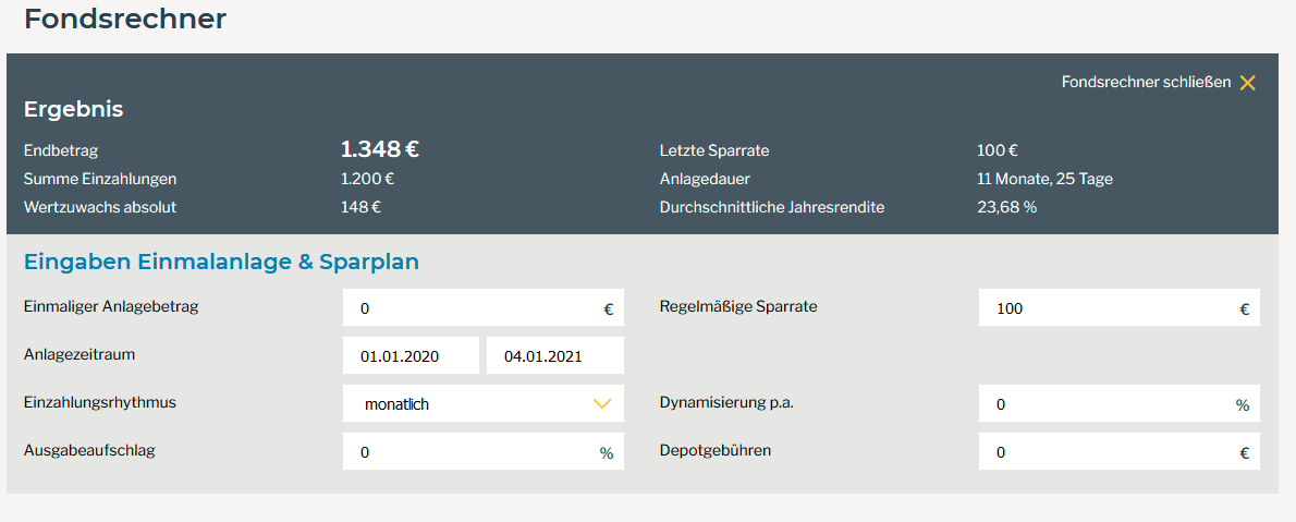 odensee Januar 6, 2021 vor 21 Minuten von Life_in_the_sun: Bei monatlichen Sparraten, abhängig vom Volumen des ETFs im Depot und ohne große Nachkäufe, dürfte das zumindest in 2020 eine Nullummer gewesen sein. Laut dem Sparplanrechner von Fondsweb hat der bei einem im Januar 2020 begonnenen Sparplan eine Jahresrendite von ca. 23% gehabt. Irgendwas ist aber da nicht richtig, die Anlagedauer ist zu kurz. Könnte so grob aber passen und hängt natürlich auch davon ab, an welchem Tag und zu welchem Kurs gekauft wurde. Diesen Beitrag teilen Link zum Beitrag