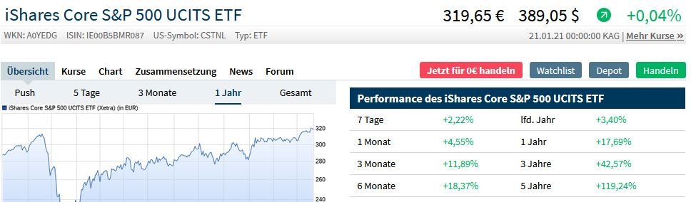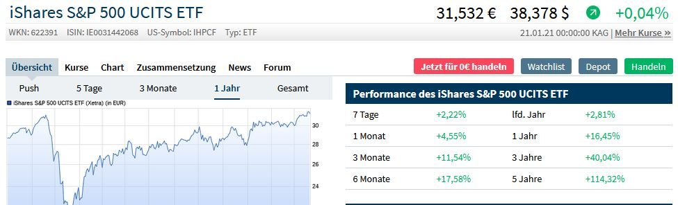 deda Januar 23, 2021 Wenn ich es richtig verstanden habe und die beiden ETFs betrachte (mit selben TER) sollte es egal sein welchen ich kaufen würde, da beide auf den selben Index gehen. Steigt der S&P um 1% steigen beide ETFs um 1%. Der eine ist teurer als der andere gilt dann nicht, nur die Stückelung ist anders? Einziger Unterschied, der 1) ist thesaurierend, der 2) ist ausschüttend. 1) iShares Core S&P 500 UCITS ETF USD - ACC ETF WKN: A0YEDG ISIN: IE00B5BMR087 318,36€ TER 0,07 2) iShares Core S&P 500 UCITS ETF - USD DIS ETF WKN: 622391 ISIN: IE0031442068 31,417€ TER 0,07 Wie kommt die Differenz zwischen den beiden ETFs für das laufende Jahr zustande (siehe Grafiken)? 1) lfd. Jahr +3,40%. und Handelsvolumen von 6,10 Mio am 22.1.21. 2) lfd. Jahr +2,81%. und Handelsvolumen von 3,67 Mio am 22.1.21. Diesen Beitrag teilen Link zum Beitrag
