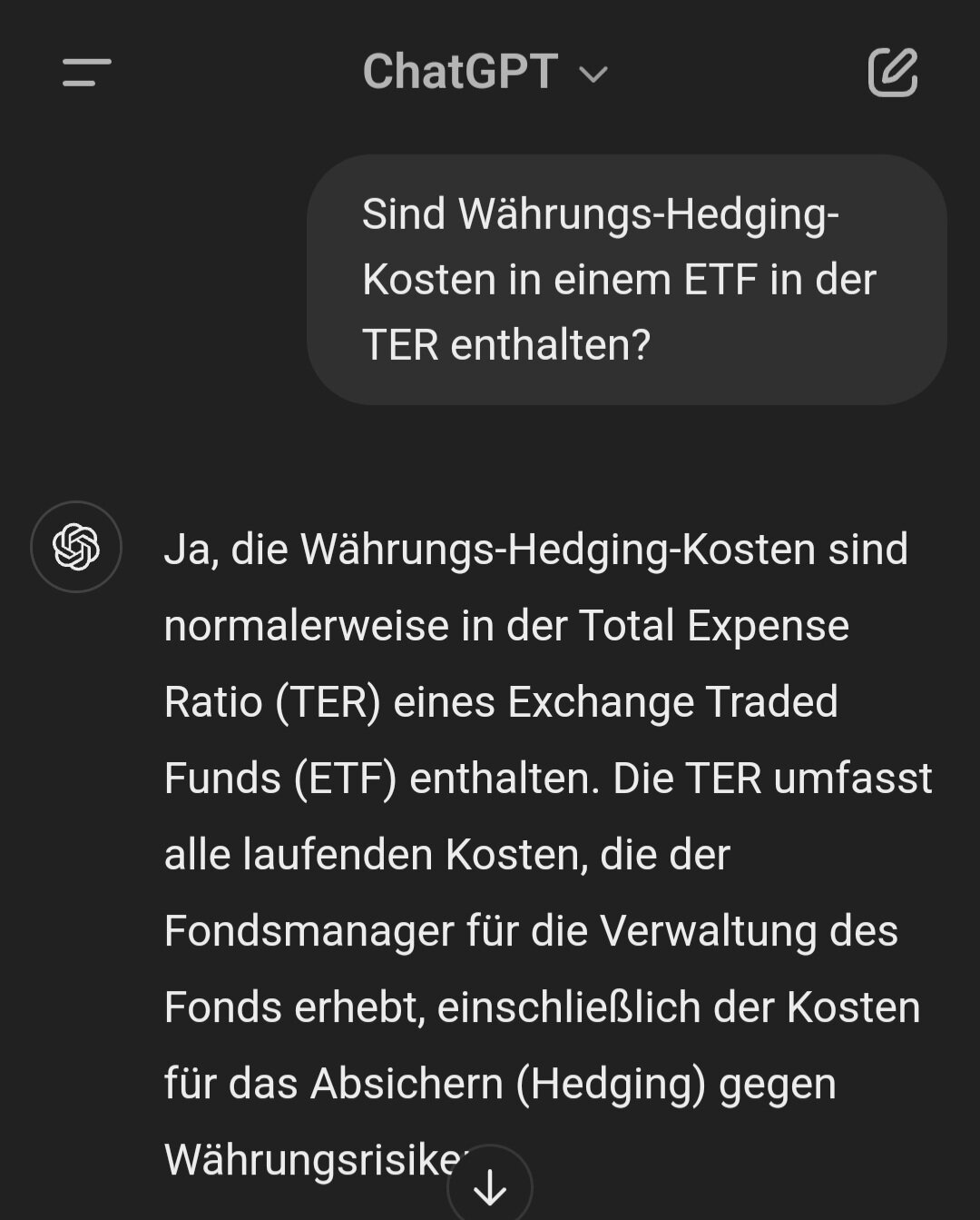 Auch das ist komplett falsch verstanden. Hier wird nur gesagt, dass sich manche Fonds-/ETF-Anbieter dafür, dass sie eine Währungssicherung im Produkt betreiben, teurer bezahlen lassen. Die Kosten einer Währungssicherung sind in der TER jedoch nie enthalten.