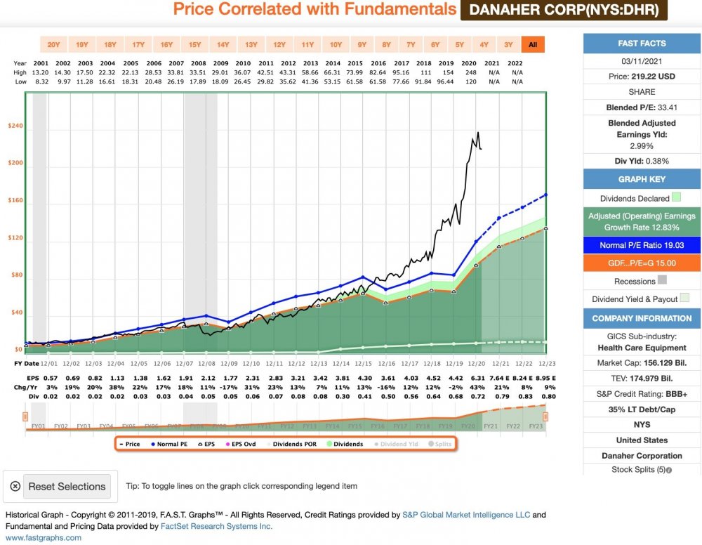 Kai_Eric März 15, 2021 vor 11 Stunden von Toni: FASTgraphs kann ja auch falsch liegen, wer weiß... Womit falsch liegen? Mit den historischen Kursen, Cash Flows oder KGVs? Oder erwartest du, dass das Unternehmen schneller wächst? +12% im Schnitt für die kommenden 3 Jahre finde ich nicht gerade wenig. Dennoch nehmen die aktuellen Kurse eigentlich die Situation des Unternehmens im Jahr 2024 vorweg, wenn man sich auf das historisch (eh schon sehr hohe) durchschnittliche KGV der letzten 10 Jahre bezieht. Danaher ist ein echt tolles Unternehmen. Die aktuellen Kurse bringen aber so einige Risiken mit sich, die vermutlich die Chancen überwiegen, die Danaher bietet. Danaher hat fast exakt die gleiche Bewertung wie Alphabet, wuchs aber über die letzten Jahre immer deutlich langsamer und das wird zummindest nach Analystenmeinung auch künftig so bleiben. Auch wenn die Chartanalyse vielleicht rosig aussieht - dieses Unternehmen ist wirklich sportlich bewertet! Diesen Beitrag teilen Link zum Beitrag