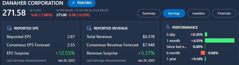 Owl Januar 25, 2023 https://investors.danaher.com/2023-01-24-Danaher-Reports-Fourth-Quarter-and-Full-Year-2022-Results Zitat For the quarter ended December 31, 2022, net earnings were $2.2 billion, or $2.99 per diluted common share which represents a 25.0% year-over-year increase from the comparable 2021 period. Non-GAAP adjusted diluted net earnings per common share were $2.87 which represents a 6.5% increase over the comparable 2021 period. Revenues increased 2.5% year-over-year in the fourth quarter of 2022 to $8.4 billion. Non-GAAP core revenue growth was 7.5%, including 7.5% non-GAAP base business core revenue growth. For the full year 2022, net earnings were $7.1 billion, or $9.66 per diluted common share which represents a 13.5% year-over-year increase. Non-GAAP adjusted diluted net earnings per common share for the year were $10.95, which represents a 9.0% increase over the comparable 2021 amount. Revenues for the full year 2022 increased 7.0% to $31.5 billion. Non-GAAP core revenue growth was 9.5%, including 8.0% non-GAAP base business core revenue growth. Operating cash flow for the full year 2022 was $8.5 billion and non-GAAP free cash flow was $7.4 billion. Diesen Beitrag teilen Link zum Beitrag