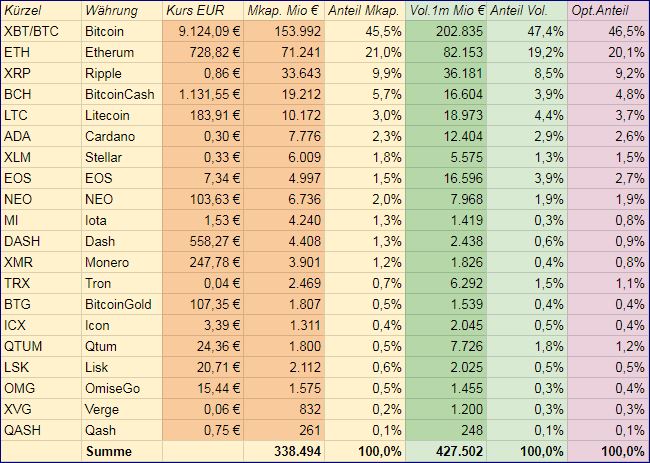 Zusätzlich zur Marktkapitalisierung habe ich die Handelsvolumen des letzten Monats hinzugezogen. Schließlich bilde ich den einfachen Durchschnitt von Marktkapitaliserungsanteil und Handelsvolumenanteil um zu einem Investitionsanteil zu kommen.