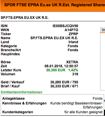 ich hatte mir für das neue Jahr vorgenommen mein Depot mal auf/umzubauen. Da ich den Immobilienmark aktuell recht spannend finde habe ich mir über justetf.com den SPDR FTSE EPRA Europe ex UK Real Estate UCITS ETF (IE00BSJCQV56) rausgesucht. Beim Versuch ihn zu kaufen bekam ich die Meldung, dass "keine Informationen vorliegen, ob er durch Privatkunden oder über Internethandel erworben werden darf".