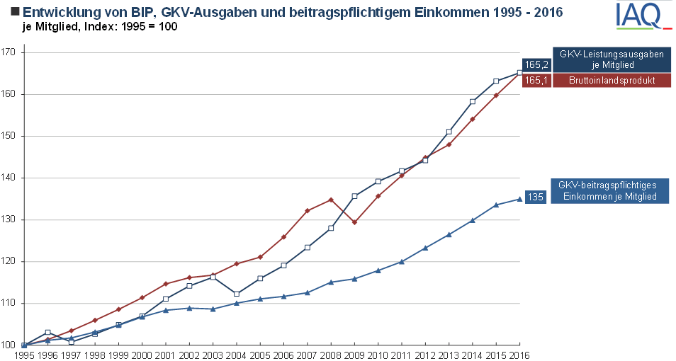 Grafik 2: Die GKV Ausgaben steigen analog des BIP. Interessant vielleicht, das beitragspflichtige Einkommen steigt wesentlich langsamer. Ergo die GKV wird "gefühlt" günstiger für höherverdienende Arbeitnehmer.