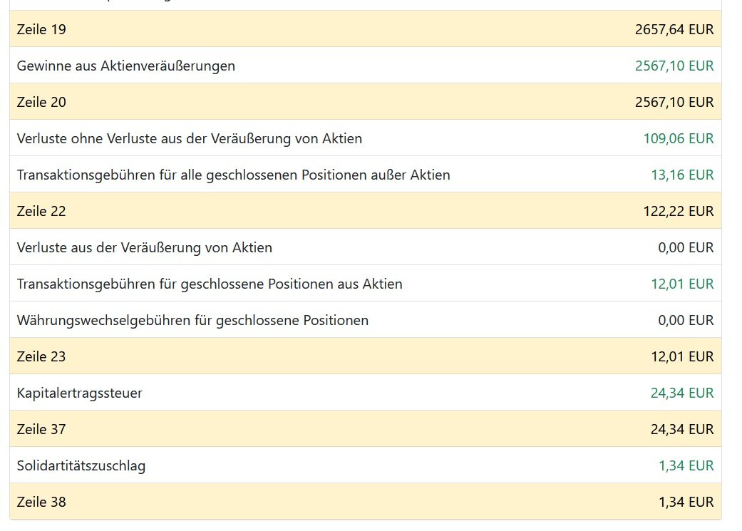 Ein direkter Fehler ist noch, dass die inländischen Kapitalertäge bei Zeile 19 abgezogen werden (letzte Zeile vor der gelben Zeile 19, bei dir 97,36). Das ist falsch weil die Dividende gar nicht enthalten war.