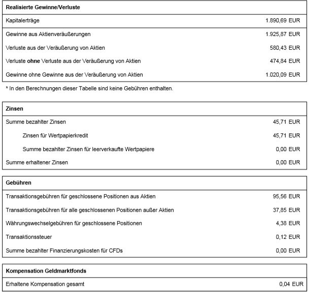 Anmerkung: Wie schon mehrmals gesagt und in der Tabelle auch erwähnt ist das nicht ganz korrekt, meiner Ansicht nach aber bei einem Geldmarktfonds der eigentlich nur den Sinn hat Guthaben zu verzinsen OK. Bei anderen (richtigen) Banken würden Guthabenzinsen ja auch in Zeile 15 landen.