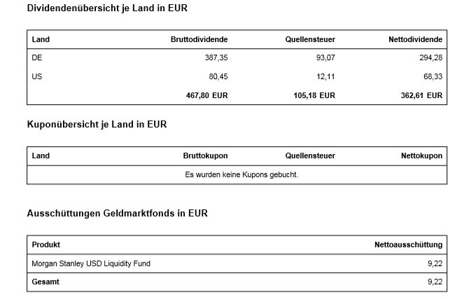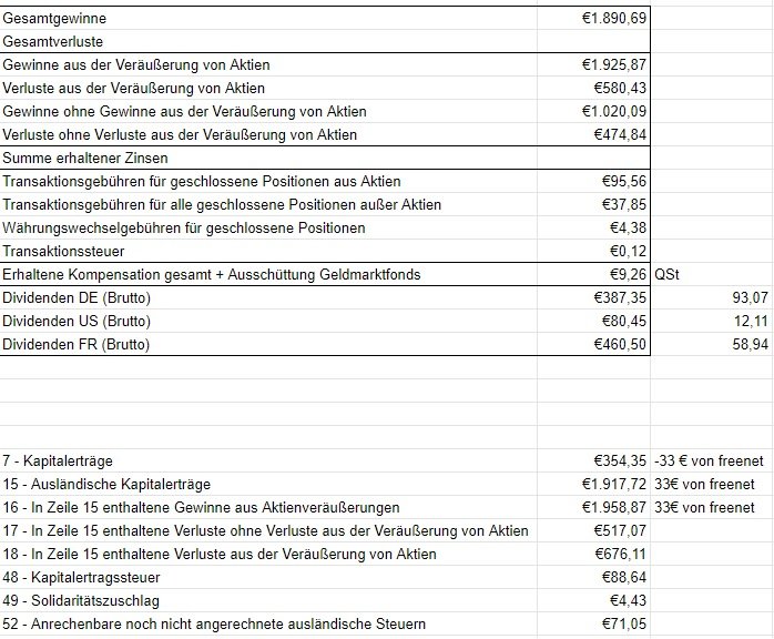 Anbei jetzt nochmal meine Daten und wie ich sie in meine KAP eintragen würde, über Anmerkungen würde ich mich freuen.:help: Einziger Posten der bei der DeGiro Abrechnung fehlt, ist eine Dividende aus Frankreich, die ich von einem anderen ausländischen Depot bekommen habe.