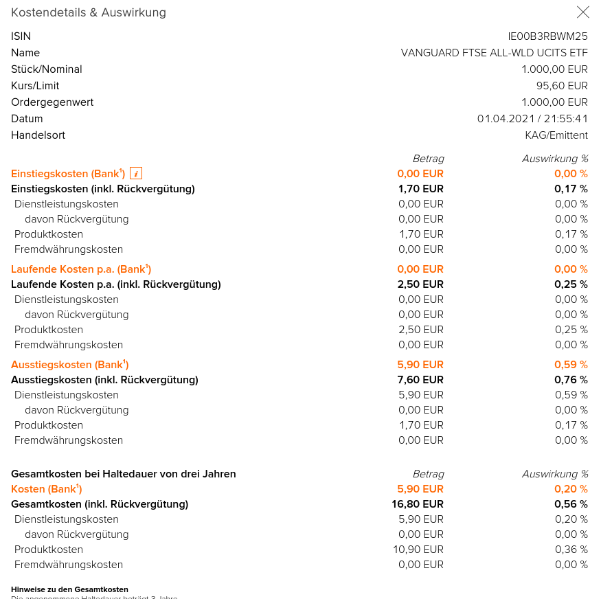 tfhb April 3, 2021 · bearbeitet April 3, 2021 von tfhb vor 13 Stunden von ETFohneFisch: Das finde ich ja mal "fies" (im Sinne von "sehr unüblich" und irreführend, da schlechter für den Kunden). Tatsächlich sehe ich bei der Anlage eines Sparplans unter "Kosteninformationen" die unscheinbare Zeile "Handelsort: KAG/Emittent". Aber wie würde sich das praktisch auswirken bei einem ETF (nehmen wir mal den Forenliebling IE00B3RBWM25)? Könnte man den denn direkt über Vanguard beziehen und welche zusätzlichen Kosten fielen dort an? (Sorry für die naive Frage, aber bislang habe ich ETF immer über die Börse oder einen der üblichen Handelsplätze gekauft.) Die ATC - die auch beim "gebührenfreien" Kauf im Kurs versteckt werden - habe ich bei flatex bisher nur über die Produktsuche der Hauptseite gefunden (nicht im Online-Banking selbst) und beträgt beim obigen ETF 0,17 %. Ist zwar nicht viel, zeigt jedoch einmal mehr die Geschäftspolitik bzw. intransparente und den Kunden oft übervorteilende Gebührenstruktur. Es ist auch bezeichnend, dass meiner Kenntnis nach kein anderer Broker solch eine Gebühr erhebt. Die meisten kaufen die ETF für Sparpläne auch - anders als flatex - direkt über eine Börse und wickeln das nicht über die KAG ab, was erst Raum für das Verstecken von Gebühren im Kurs verschafft. Diesen Beitrag teilen Link zum Beitrag