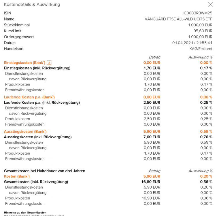 votacom April 4, 2021 On 4/3/2021 at 9:53 AM, tfhb said: Die ATC - die auch beim "gebührenfreien" Kauf im Kurs versteckt werden - habe ich bei flatex bisher nur über die Produktsuche der Hauptseite gefunden (nicht im Online-Banking selbst) Ich erblicke sie auch auf der Kosten/Vorabinfo (nach MIFID II): Im "Sparplan anlegen" Formular dem Link "Kostendetails & Auswirkung" folgen. Die "Produktkosten" unter Einstiegs- und Ausstiegskosten sind wohl die ATC: Diesen Beitrag teilen Link zum Beitrag